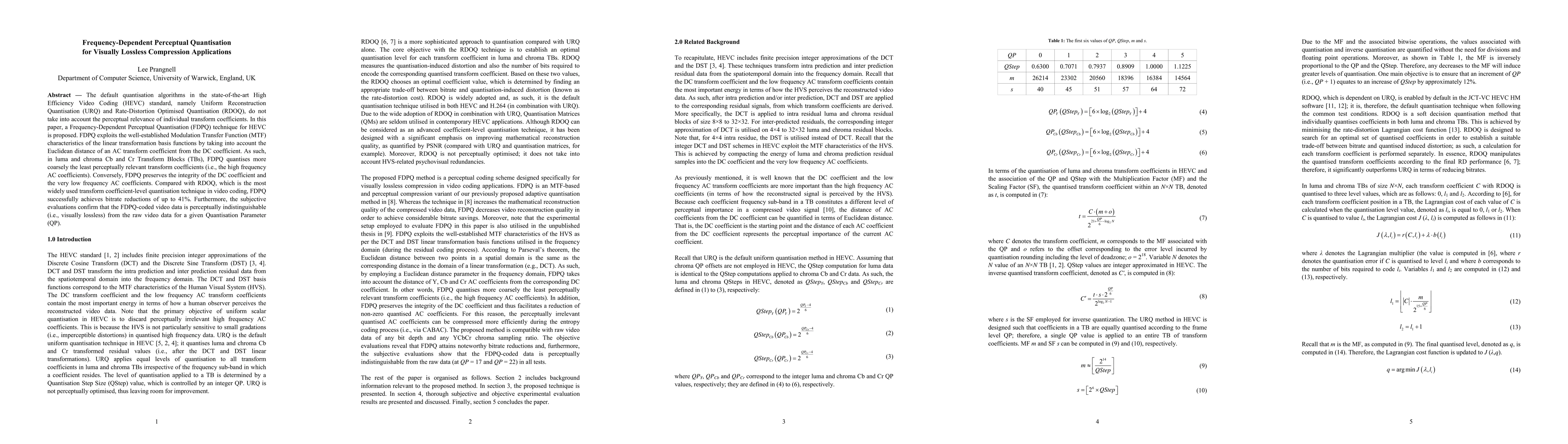 This paper proposes a Frequency-Dependent Perceptual Quantisation (FDPQ) technique for HEVC, which quantises less perceptually relevant high-frequency transform coefficients more coarsely while preserving the integrity of low-frequency coefficients. FDPQ achieves up to 41% bitrate reduction compared to RDOQ and maintains perceptually lossless video quality.
