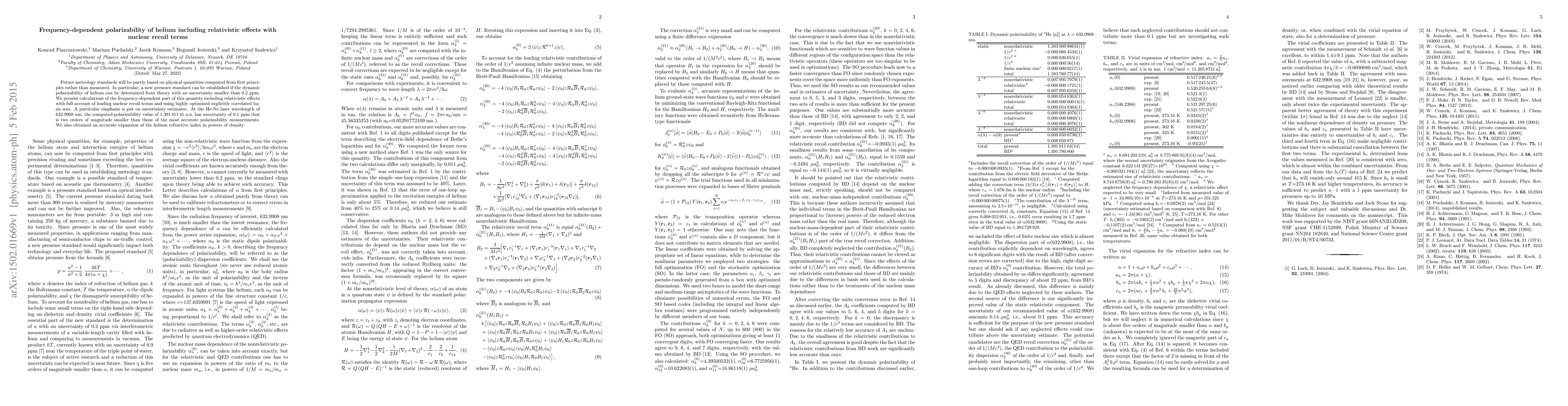 Future metrology standards will be partly based on physical quantities computed from first principles rather than measured. In particular, a new pressure standard can be established if the dynamic polarizability of helium can be determined from theory with an uncertainty smaller than 0.2 ppm. We present calculations of the frequency-dependent part of this quantity including relativistic effects with full account of leading nuclear recoil terms and using highly optimized explicitly correlated basis sets. A particular emphasis is put on uncertainty estimates. At the He-Ne laser wavelength of 632.9908 nm, the computed polarizability value of 1.391 811 41 a.u. has uncertainty of 0.1 ppm that is two orders of magnitude smaller than those of the most accurate polarizability measurements. We also obtained an accurate expansion of the helium refractive index in powers of density.