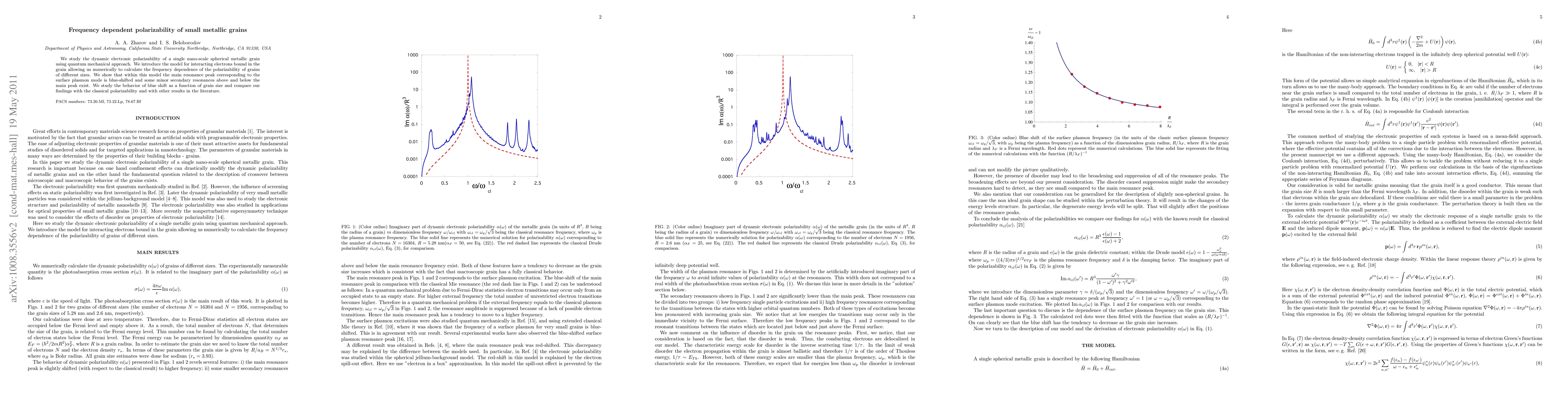 This research numerically calculates the frequency-dependent polarizability of single nano-scale metallic spheres using quantum mechanics. It reveals a blue-shifted main resonance peak for the surface plasmon mode, with minor secondary resonances above and below, and examines how this blue shift varies with grain size, comparing findings to classical models.