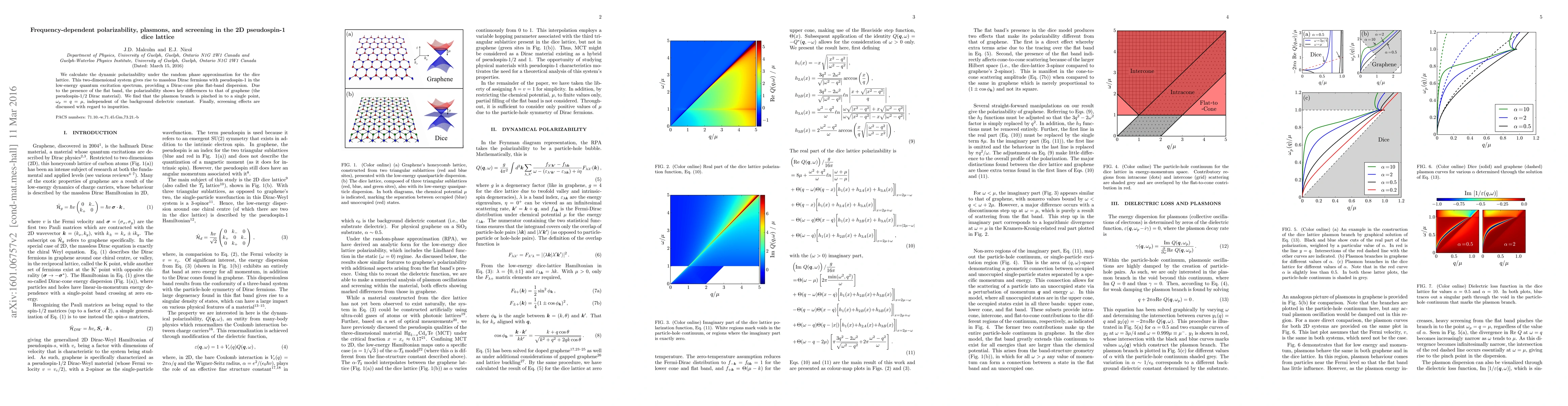 This paper examines the dynamic polarizability of the 2D dice lattice, revealing unique features due to its pseudospin-1 Dirac fermions. The plasmon branch converges to a single point, differing from graphene, and discusses screening effects in the presence of impurities.