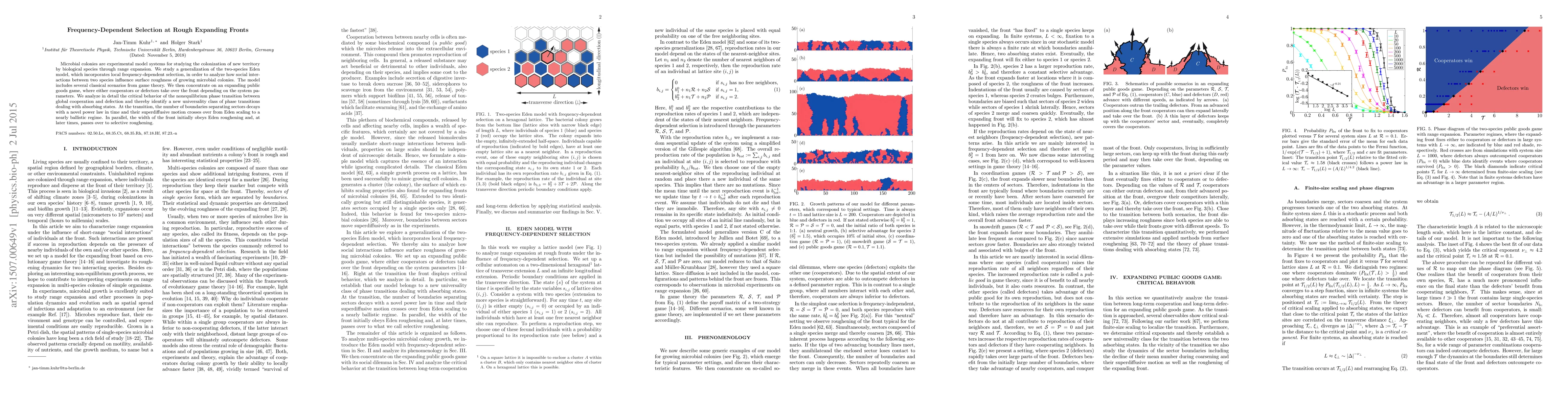 This paper investigates the dynamics of microbial colony expansion using a generalized two-species Eden model with local frequency-dependent selection, focusing on the social interactions influencing colony roughness. It reveals a new universality class of phase transitions in the context of public goods games, characterized by a novel power law decay of boundaries and superdiffusive motion transitioning from Eden to ballistic regimes.
