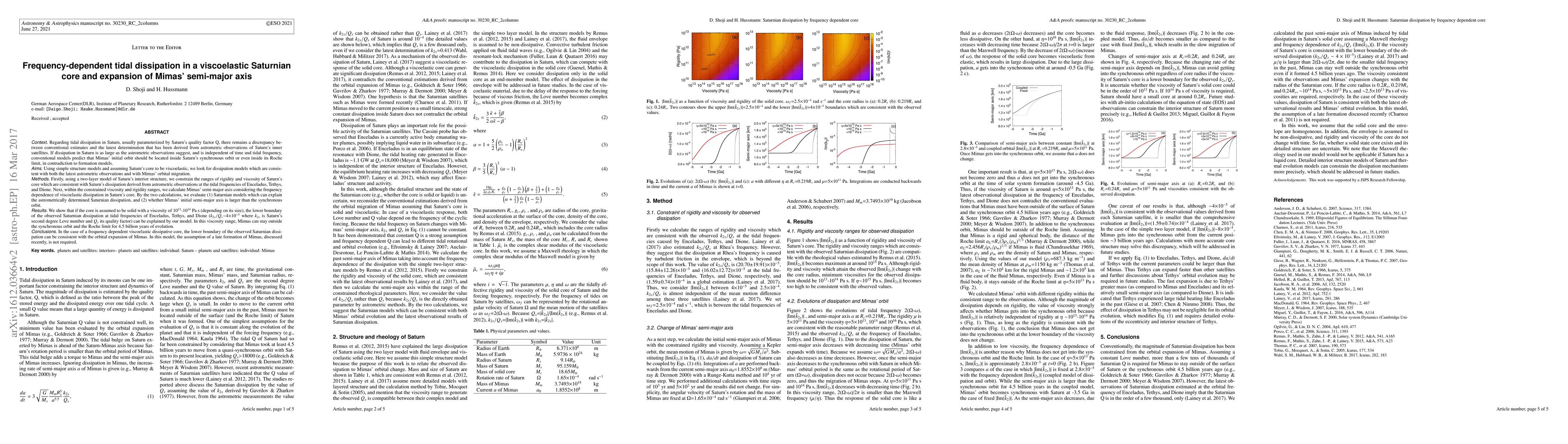 This paper investigates frequency-dependent tidal dissipation in Saturn's viscoelastic core and its impact on the orbital evolution of Mimas. It finds that a core with viscosity in the range of 10^13-10^14 Pa s can explain the observed dissipation and allow Mimas to remain outside Saturn's synchronous orbit and Roche limit over its 4.5 billion years of evolution.