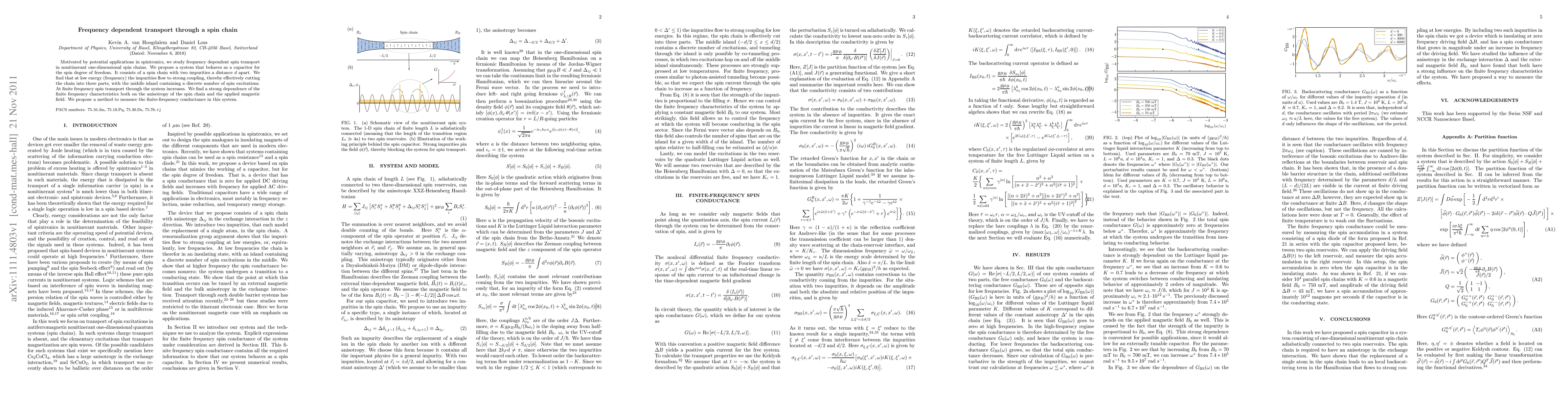 This research investigates spin transport in one-dimensional spin chains, proposing a system acting as a 'spin capacitor' with two impurities. At low energy, impurities strong-couple, segmenting the chain; at finite frequency, spin transport increases, significantly influenced by chain anisotropy and magnetic field. The study suggests a method to measure finite-frequency conductance in such systems.