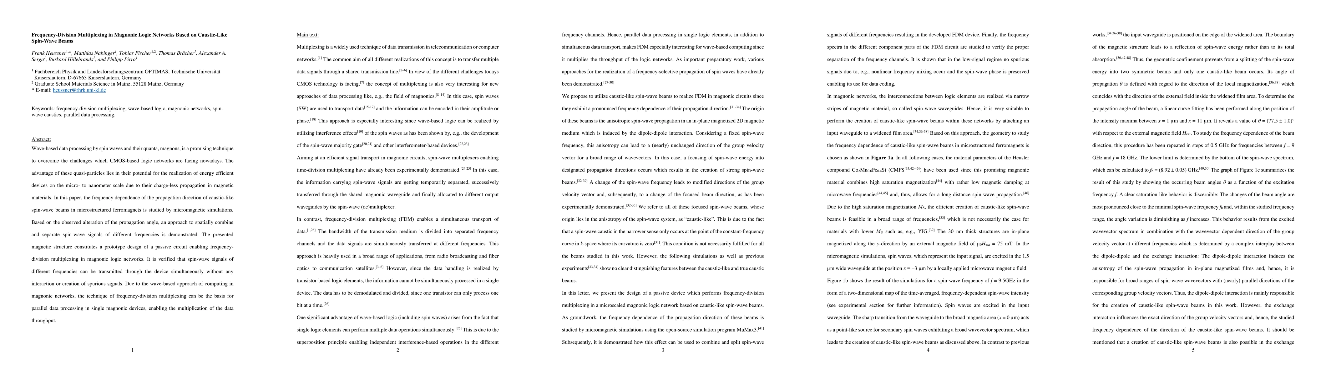 This paper explores the use of caustic-like spin-wave beams in microstructured ferromagnets for frequency-division multiplexing in magnonic logic networks, demonstrating a passive circuit design capable of combining and separating spin-wave signals of different frequencies without interaction. The study suggests this approach can enhance parallel data processing and data throughput in magnonic devices.