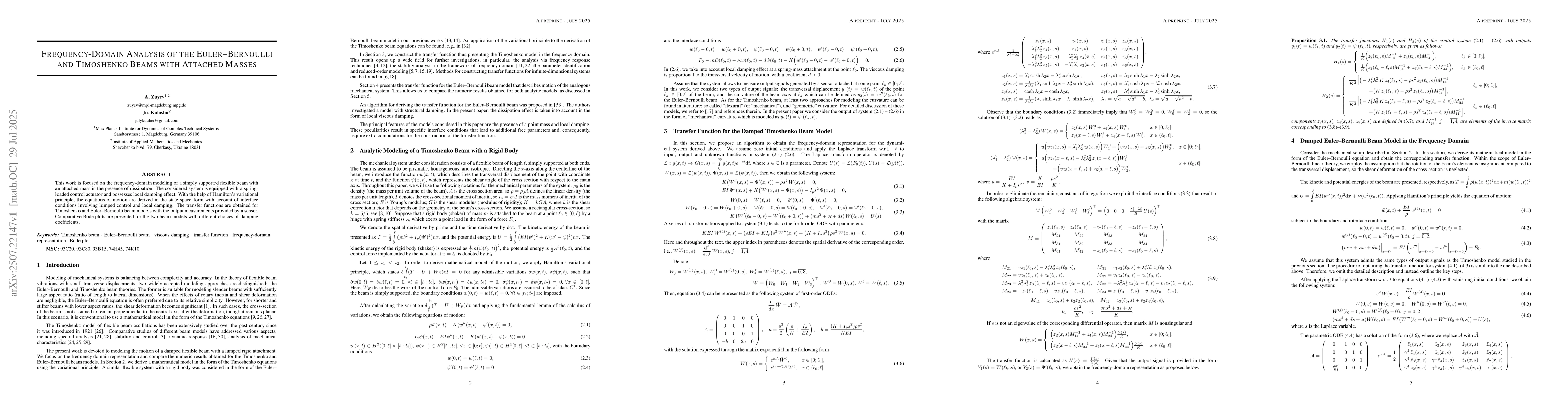 This work is focused on the frequency-domain modeling of a simply supported flexible beam with an attached mass in the presence of dissipation. The considered system is equipped with a spring-loaded control actuator and possesses local damping effect. With the help of Hamilton's variational principle, the equations of motion are derived in the state space form with account of interface conditions involving lumped control and local damping. The transfer functions are obtained for Timoshenko and Euler--Bernoulli beam models with the output measurements provided by a sensor. Comparative Bode plots are presented for the two beam models with different choices of damping coefficients.