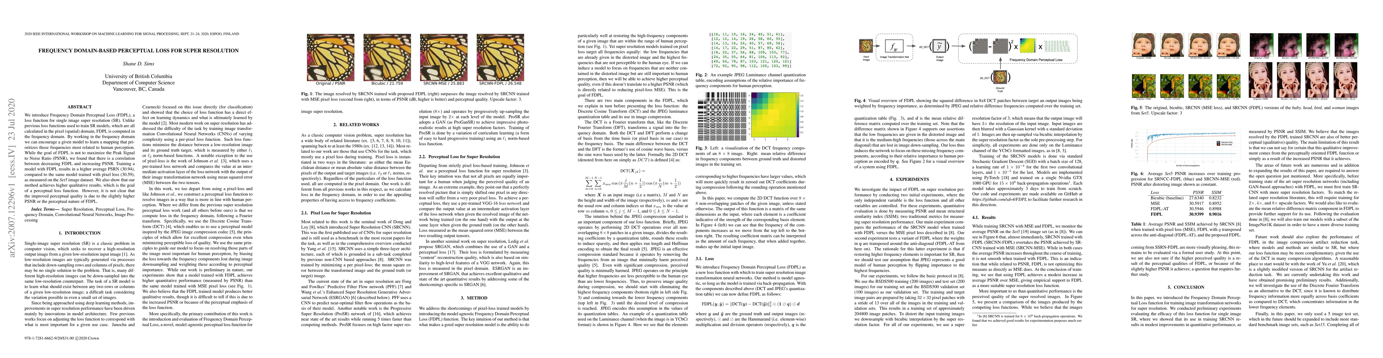 This paper introduces Frequency Domain Perceptual Loss (FDPL) for single image super resolution, computed in the frequency domain to prioritize perceptually relevant frequencies. FDPL improves average PSNR and achieves higher qualitative results compared to pixel loss, though the exact contribution of perceptual quality remains unclear.