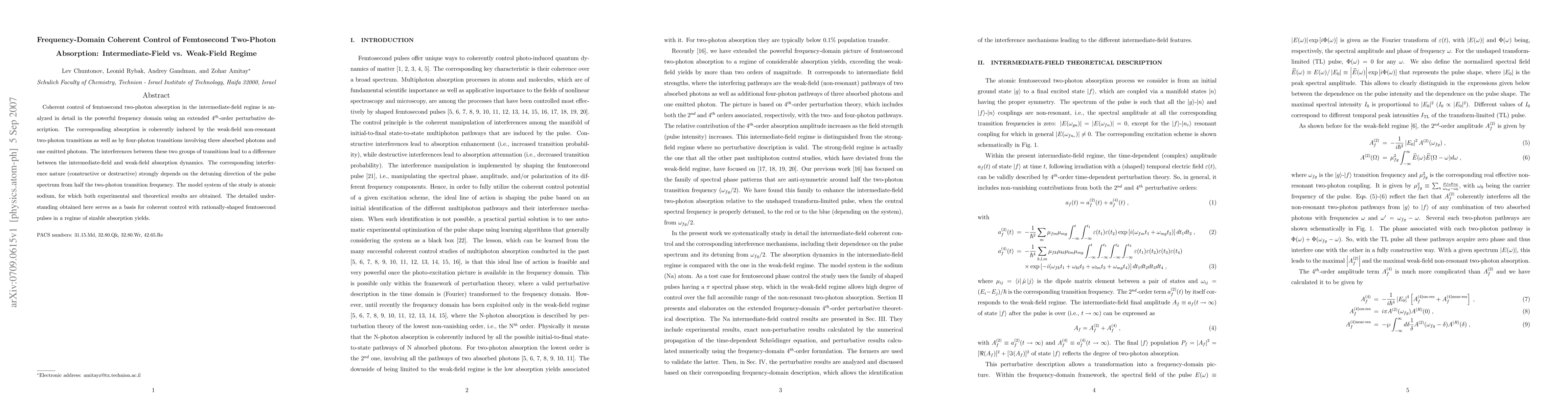 This paper analyzes coherent control of femtosecond two-photon absorption in atomic sodium, focusing on the intermediate-field regime using a 4th-order perturbative approach. It reveals that interference between weak-field and four-photon transitions affects absorption dynamics, with the interference nature depending on pulse spectrum detuning.