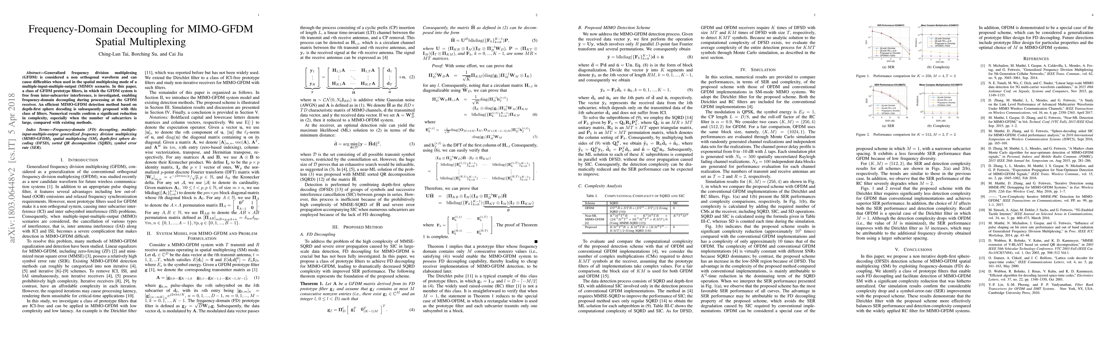 This paper investigates GFDM prototype filters that enable frequency-domain decoupling in MIMO spatial multiplexing, proposing an efficient MIMO-GFDM detection method based on depth-first sphere decoding. Numerical results show a significant reduction in complexity, especially with a large number of subcarriers, compared to existing methods.