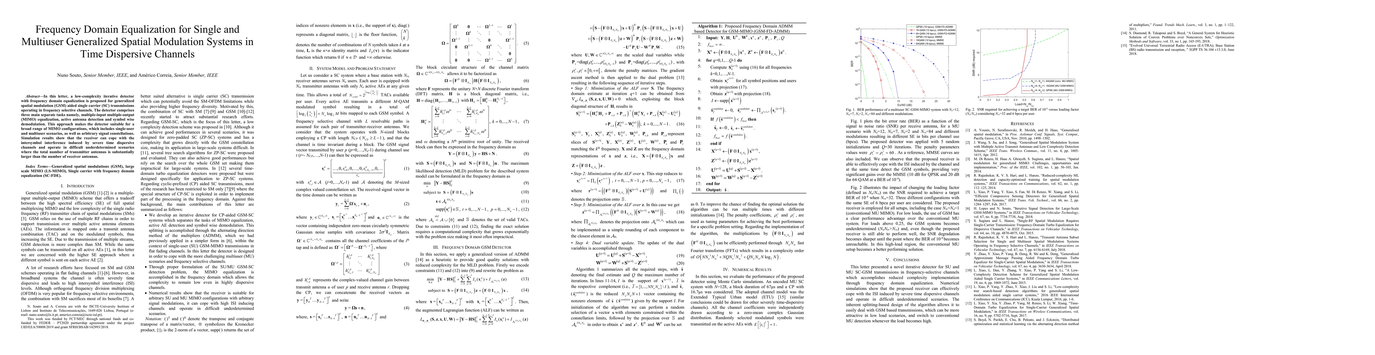 This paper proposes a low-complexity iterative detector with frequency domain equalization for generalized spatial modulation in single and multiuser scenarios. The detector effectively handles intersymbol interference in time dispersive channels and is suitable for various MIMO configurations.