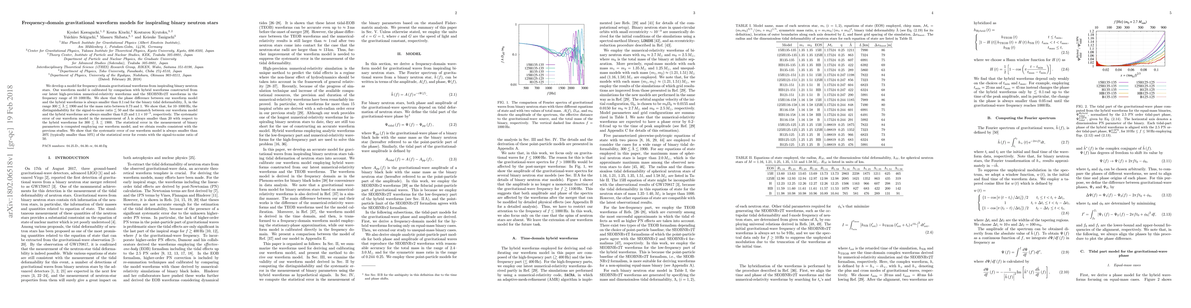 We develop a model for frequency-domain gravitational waveforms from inspiraling binary neutron stars. Our waveform model is calibrated by comparison with hybrid waveforms constructed from our latest high-precision numerical-relativity waveforms and the SEOBNRv2T waveforms in the frequency range of $10$--$1000\,{\rm Hz}$. We show that the phase difference between our waveform model and the hybrid waveforms is always smaller than $0.1\, {\rm rad}$ for the binary tidal deformability, ${\tilde \Lambda}$, in the range $300\lesssim{\tilde \Lambda}\lesssim1900$ and for the mass ratio between 0.73 and 1. We show that, for $10$--$1000\,{\rm Hz}$, the distinguishability for the signal-to-noise ratio $\lesssim50$ and the mismatch between our waveform model and the hybrid waveforms are always smaller than 0.25 and $1.1\times10^{-5}$, respectively. The systematic error of our waveform model in the measurement of ${\tilde \Lambda}$ is always smaller than $20$ with respect to the hybrid waveforms for $300\lesssim{\tilde \Lambda}\lesssim1900$. The statistical error in the measurement of binary parameters is computed employing our waveform model, and we obtain results consistent with the previous studies. We show that the systematic error of our waveform model is always smaller than $20\%$ (typically smaller than $10\%$) of the statistical error for events with the signal-to-noise ratio of $50$.