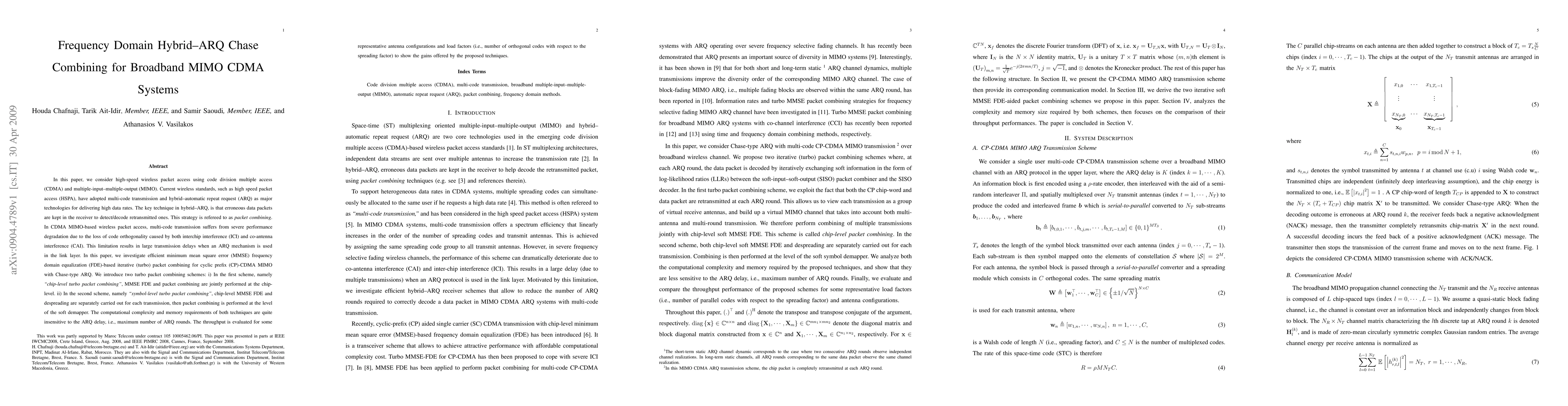 This paper proposes two turbo packet combining schemes for broadband MIMO CDMA systems using hybrid-ARQ with Chase-type retransmissions to improve performance and reduce delays. The schemes involve either chip-level or symbol-level iterative combining with MMSE frequency domain equalization, demonstrating gains in throughput with manageable complexity.