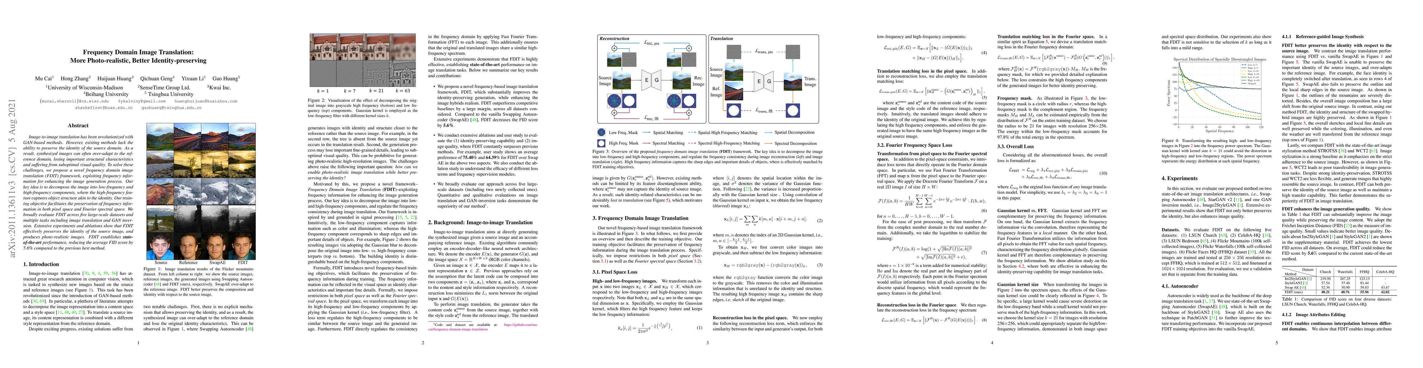 This research is significant as it introduces a novel frequency domain image translation framework that addresses the challenge of identity preservation in image-to-image translation tasks, resulting in more photo-realistic and identity-preserving images.