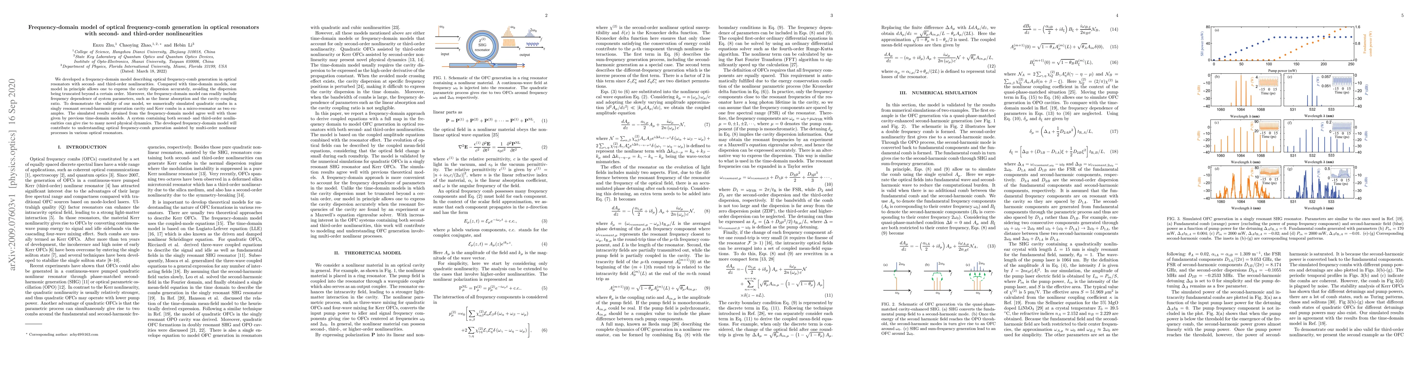 This research paper presents a frequency-domain model for optical frequency-comb generation in optical resonators, emphasizing second- and third-order nonlinearities. The new model accurately expresses cavity dispersion and includes frequency-dependent parameters, demonstrating its validity through simulations of quadratic and Kerr combs, which align well with previous time-domain models.