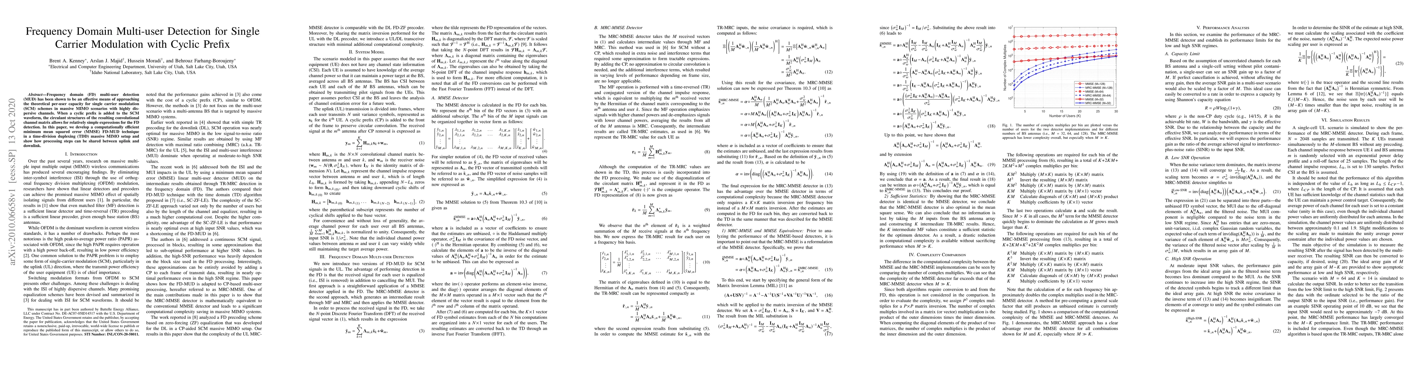 Frequency domain (FD) multi-user detection (MUD) has been shown to be an effective means of approaching the theoretical per-user capacity for single carrier modulation (SCM) schemes in massive MIMO scenarios with highly dispersive channels. When a cyclic prefix is added to the SCM waveform, the circulant structures of the resulting convolutional channel matrix allows for relatively simple expressions for the FD detection. In this paper, we develop a computationally efficient minimum mean squared error (MMSE) FD-MUD technique in a time-division duplexing (TDD) massive MIMO setup and show how processing steps can be shared between uplink and downlink.