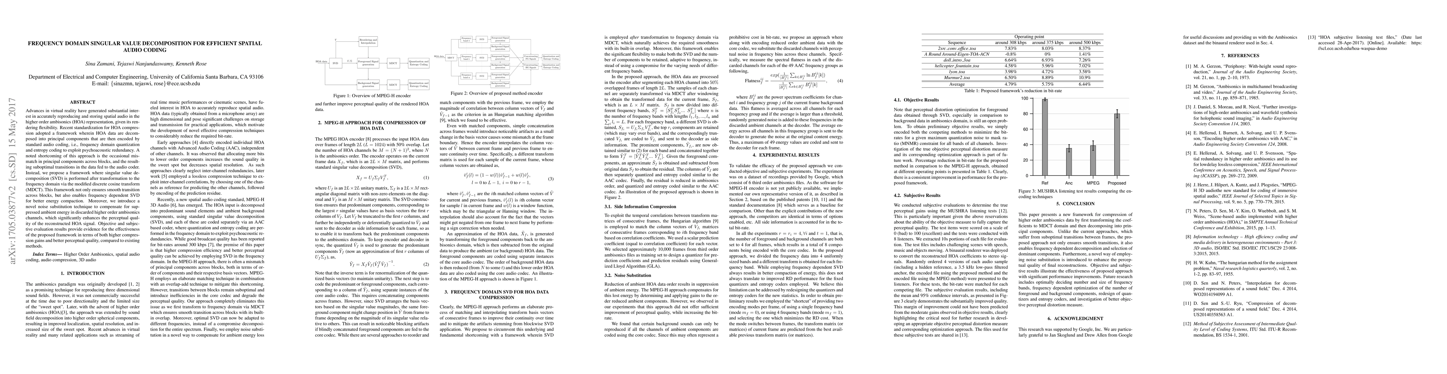 This paper proposes a frequency domain singular value decomposition (SVD) framework for spatial audio coding in higher order ambisonics, utilizing modified discrete cosine transform (MDCT) to ensure smooth transitions and better energy compaction. It also introduces a noise substitution technique to improve perceptual quality, demonstrating superior compression gains and perceptual performance over existing methods.