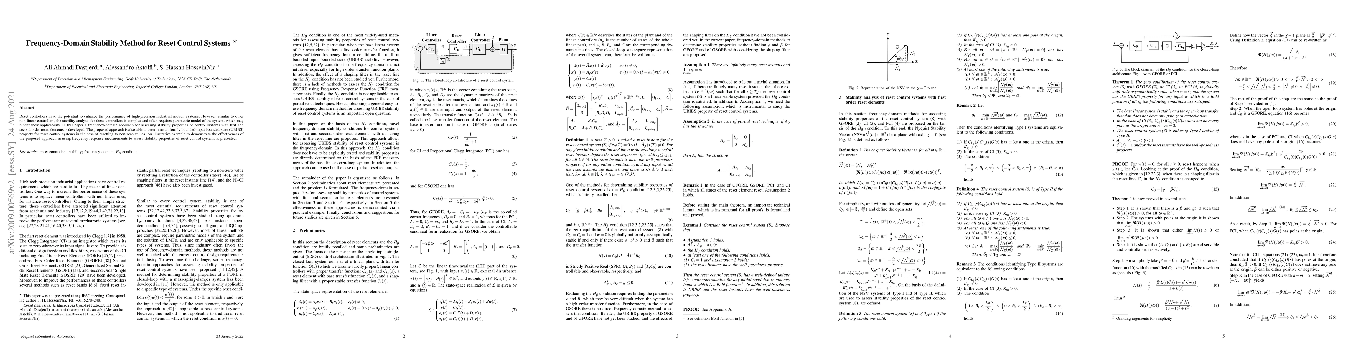 Today, linear PID controllers cannot satisfy requirements of high-precision industry due to the development of technology. According to the literature, reset controllers can overcome this important barrier. However, similar to other non-linear controllers, stability analysis for these controllers is complex and needs parametric models of the systems. Consequently, the applicability of these controllers may diminish in industry. The well-known Hb method is one of the solutions of this significant problem. Nevertheless, assessing the Hb condition in the frequency-domain is complex, particularly for high dimensional plants. Furthermore, it cannot assess UBIBS stability of reset control systems in the case of reseting to non-zero values. In this paper, the aforementioned problems have been solved for the first and second order reset elements and a frequency-domain approach for assessing stability of reset control systems is developed. Finally, some practical examples are presented to demonstrate the effectiveness of the proposed approach to use the frequency response measurement directly to assess the stability.