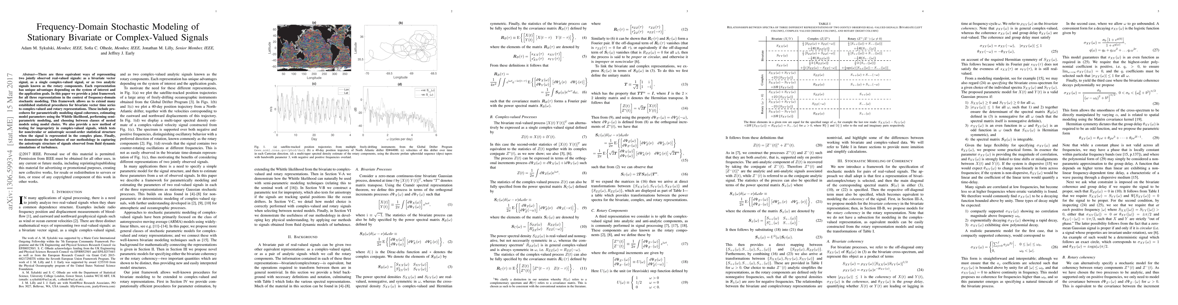 There are three equivalent ways of representing two jointly observed real-valued signals: as a bivariate vector signal, as a single complex-valued signal, or as two analytic signals known as the rotary components. Each representation has unique advantages depending on the system of interest and the application goals. In this paper we provide a joint framework for all three representations in the context of frequency-domain stochastic modeling. This framework allows us to extend many established statistical procedures for bivariate vector time series to complex-valued and rotary representations. These include procedures for parametrically modeling signal coherence, estimating model parameters using the Whittle likelihood, performing semi-parametric modeling, and choosing between classes of nested models using model choice. We also provide a new method of testing for impropriety in complex-valued signals, which tests for noncircular or anisotropic second-order statistical structure when the signal is represented in the complex plane. Finally, we demonstrate the usefulness of our methodology in capturing the anisotropic structure of signals observed from fluid dynamic simulations of turbulence.