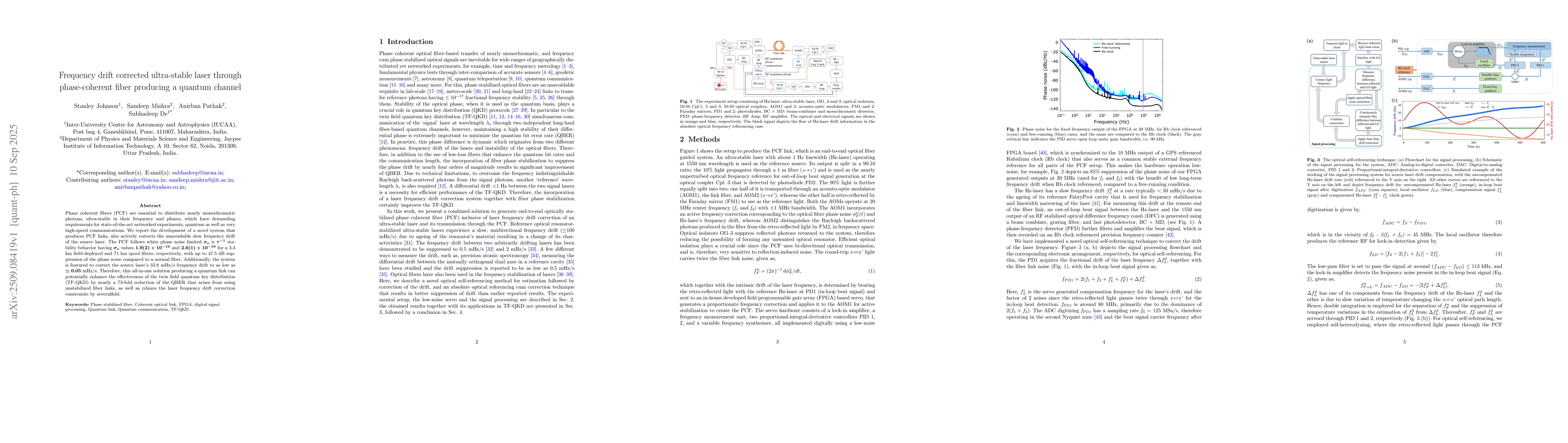 Phase coherent fibers (PCF) are essential to distribute nearly monochromatic photons, ultra-stable in their frequency and phases, which have demanding requirements for state-of-the-art networked experiments, quantum as well as very high-speed communications. We report the development of a novel system that produces PCF links, also actively corrects the unavoidable slow frequency drift of the source laser. The PCF follows white phase noise limited $\sigma_o \times \tau^{-1}$ stability behavior having $\sigma_o$ values $1.9(2) \times 10^{-16}$ and $2.6(1) \times 10^{-16}$ for a 3.3 km field-deployed and 71 km spool fibers, respectively, with up to 47.5 dB suppression of the phase noise compared to a normal fiber. Additionally, the system is featured to correct the source laser's 33.8 mHz/s frequency drift to as low as $\simeq 0.05$ mHz/s. Therefore, this all-in-one solution producing a quantum link can potentially enhance the effectiveness of the twin field quantum key distribution (TF-QKD) by nearly a 73-fold reduction of the QBER that arises from using unstabilized fiber links, as well as relaxes the laser frequency drift correction constraints by severalfold.