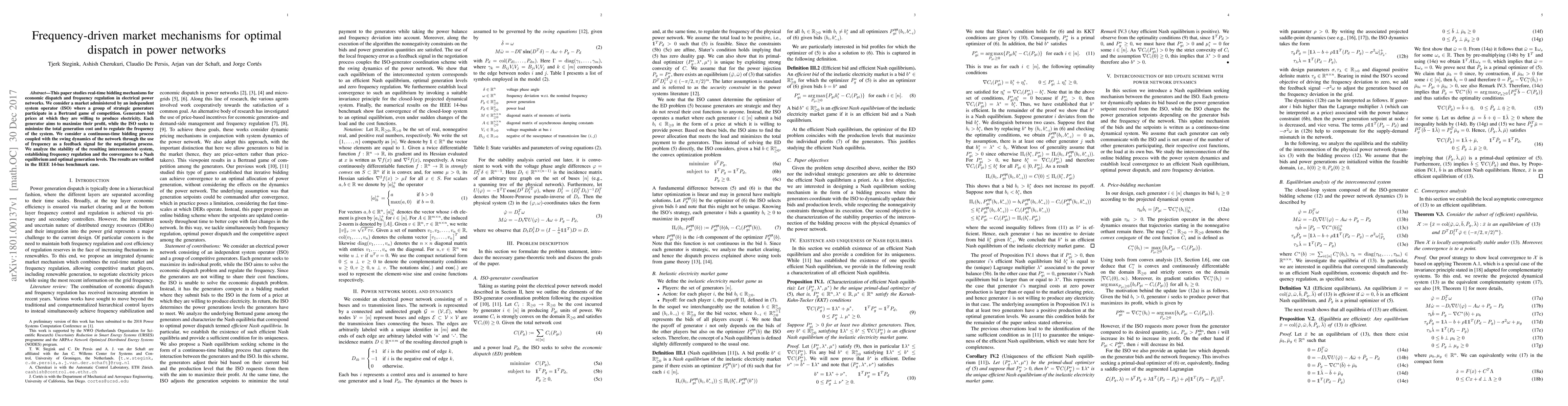 This paper studies real-time bidding mechanisms for economic dispatch and frequency regulation in electrical power networks. We consider a market administered by an independent system operator (ISO) where a group of strategic generators participate in a Bertrand game of competition. Generators bid prices at which they are willing to produce electricity. Each generator aims to maximize their profit, while the ISO seeks to minimize the total generation cost and to regulate the frequency of the system. We consider a continuous-time bidding process coupled with the swing dynamics of the network through the use of frequency as a feedback signal for the negotiation process. We analyze the stability of the resulting interconnected system, establishing frequency regulation and the convergence to a Nash equilibrium and optimal generation levels. The results are verified in the IEEE 14-bus benchmark case.