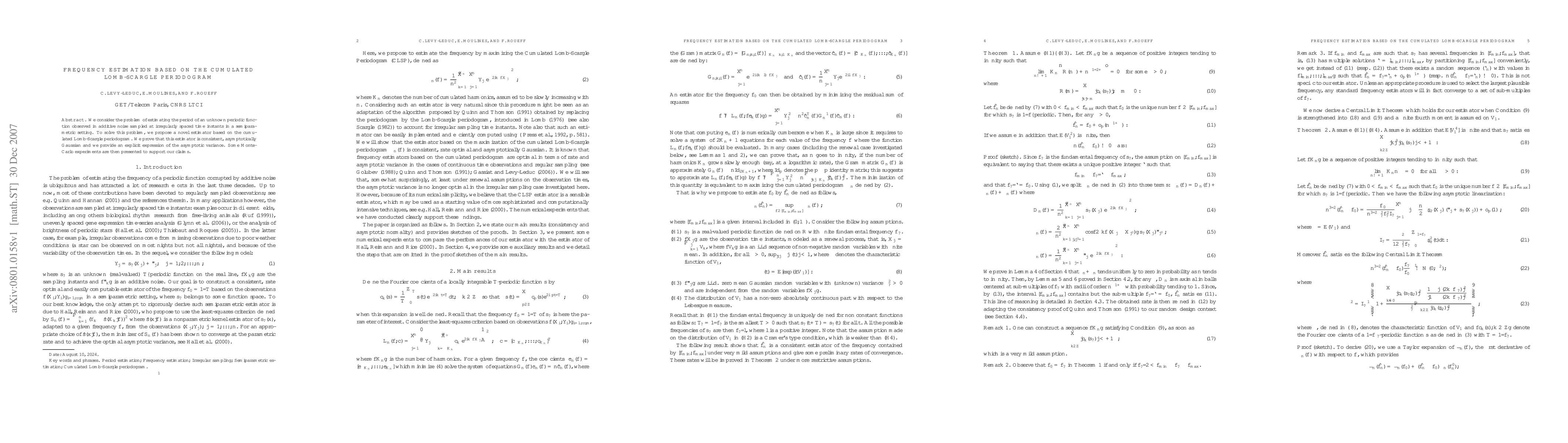 This paper proposes a new estimator for frequency based on the cumulated Lomb-Scargle periodogram to handle periodic functions observed in noisy, irregularly spaced data. The estimator is shown to be consistent, asymptotically Gaussian, and the paper provides an explicit expression for its asymptotic variance, supported by Monte-Carlo experiments.