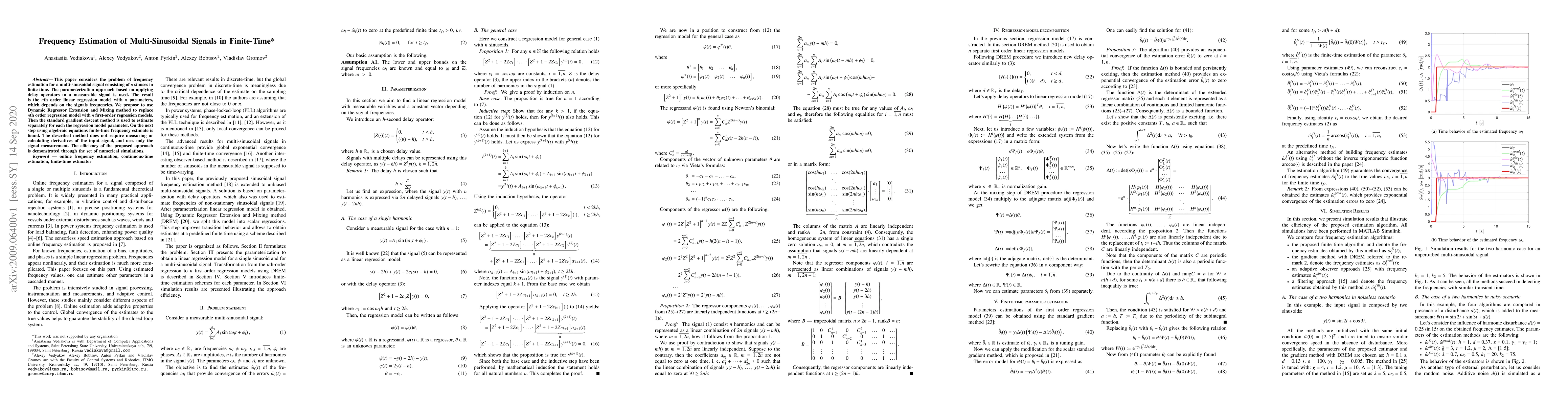 This paper considers the problem of frequency estimation for a multi-sinusoidal signal consisting of n sinuses in finite-time. The parameterization approach based on applying delay operators to a measurable signal is used. The result is the nth order linear regression model with n parameters, which depends on the signals frequencies. We propose to use Dynamic Regressor Extension and Mixing method to replace nth order regression model with n first-order regression models. Then the standard gradient descent method is used to estimate separately for each the regression model parameter. On the next step using algebraic equations finite-time frequency estimate is found. The described method does not require measuring or calculating derivatives of the input signal, and uses only the signal measurement. The efficiency of the proposed approach is demonstrated through the set of numerical simulations.