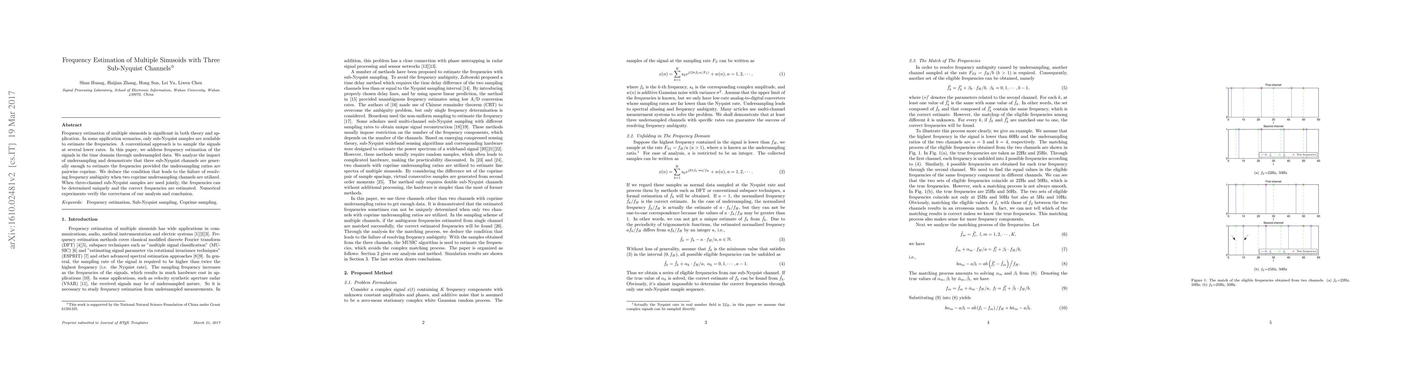 This paper investigates frequency estimation of multiple sinusoids using three sub-Nyquist channels, demonstrating that undersampling ratios being pairwise coprime allows for accurate frequency determination. It identifies conditions for resolving frequency ambiguity and verifies the method's effectiveness through numerical experiments.