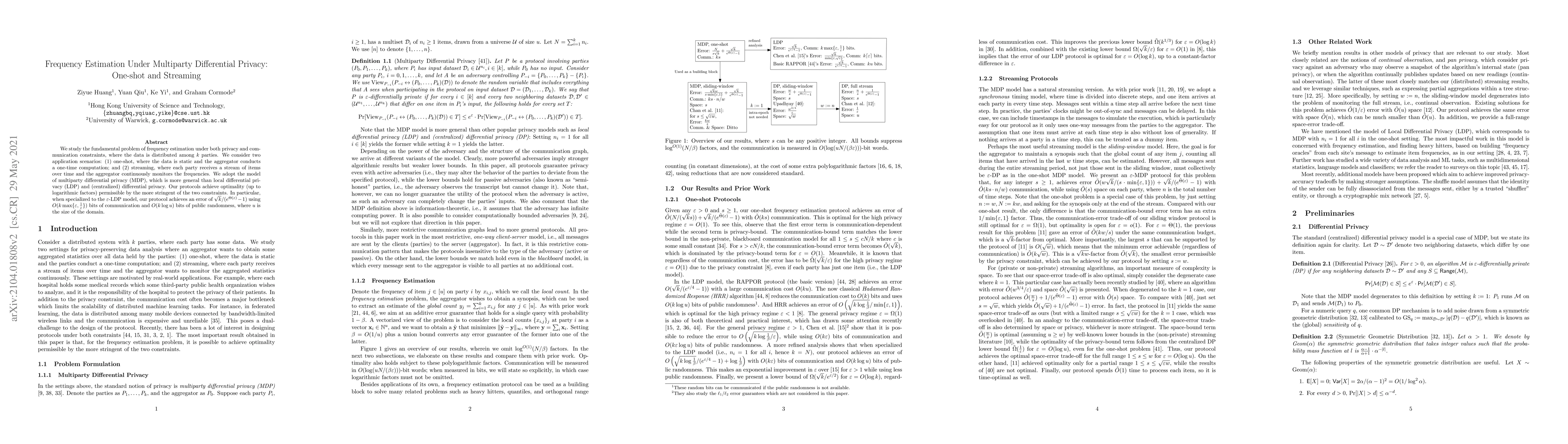 This paper investigates frequency estimation under multiparty differential privacy for both one-shot and streaming data scenarios. It proposes protocols achieving near-optimal error rates and communication efficiency within the stricter of the two constraints, with specific results for the $\varepsilon$-LDP model.