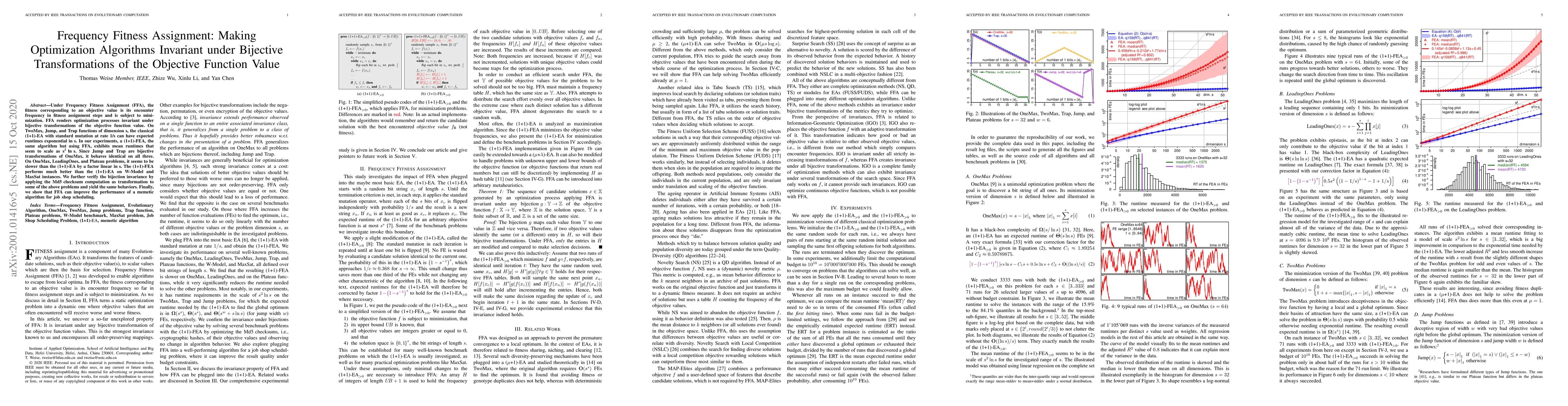 A new optimization algorithm called Frequency Fitness Assignment (FFA) improves performance on various problems, including those with exponential scaling runtimes, and is invariant under bijective transformations of the objective function value.