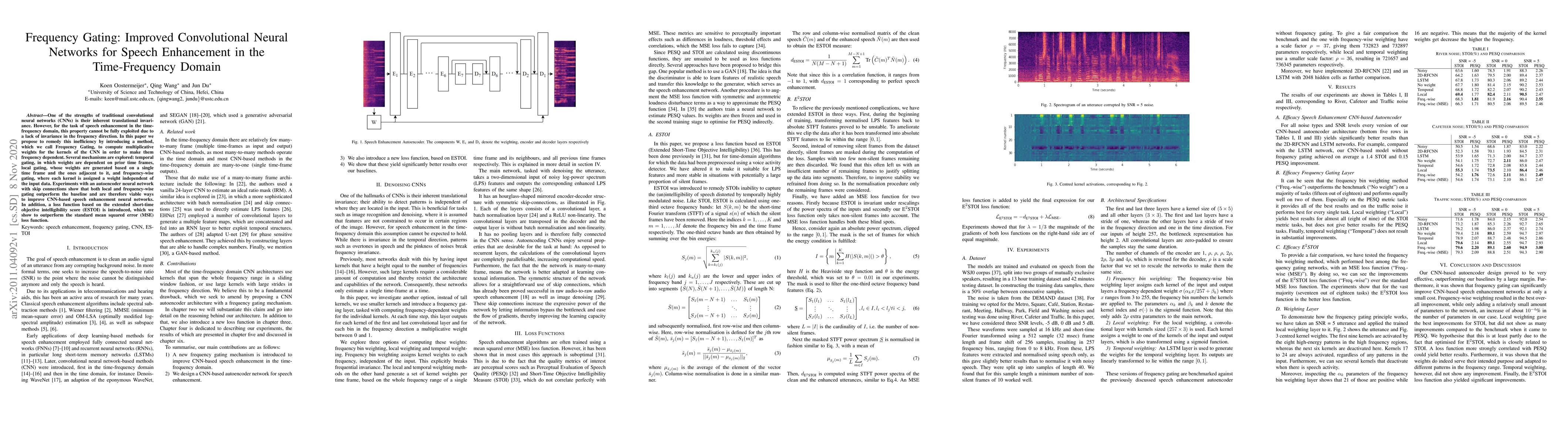 This paper proposes a method called Frequency Gating to enhance convolutional neural networks (CNNs) for speech enhancement by making the kernels frequency dependent. Various gating mechanisms are explored, and experiments show that local and frequency-wise gating improve performance over the baseline. Additionally, a new loss function based on the extended short-time objective intelligibility score (ESTOI) is introduced, which outperforms the standard mean squared error (MSE) loss function.