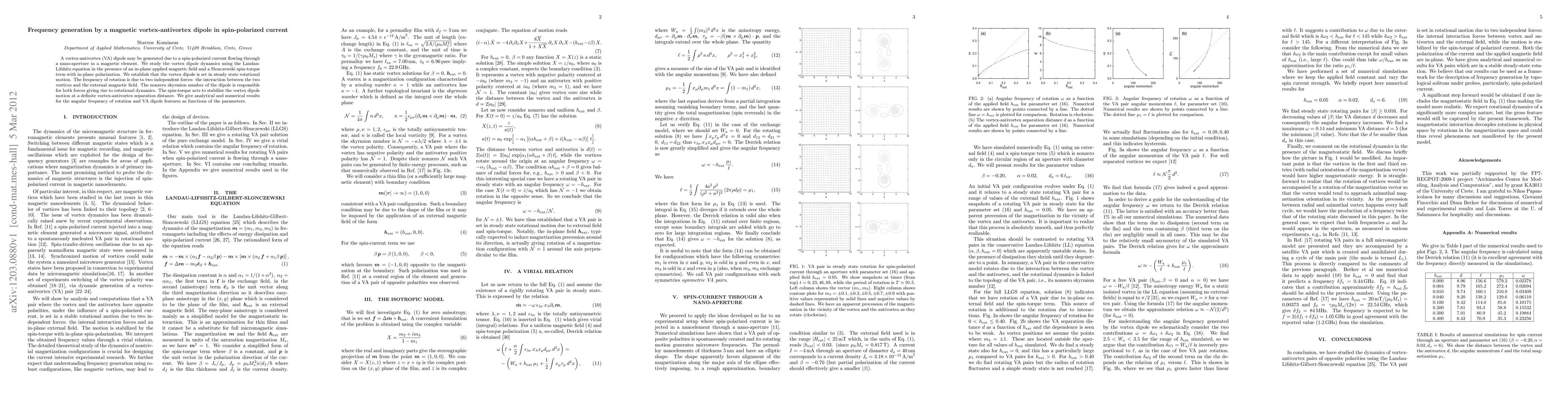 This paper investigates the dynamics of a vortex-antivortex dipole in a magnetic element driven by spin-polarized current through a nano-aperture. The study reveals that the dipole rotates at a steady angular frequency due to interactions between the vortices and an applied magnetic field, with the spin-torque stabilizing the dipole's separation.