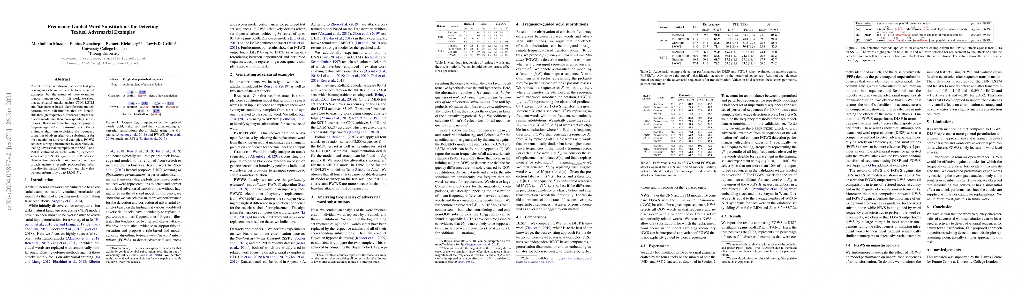 The paper introduces FGWS, a simple yet effective algorithm for detecting adversarial examples by leveraging frequency properties of adversarial word substitutions.