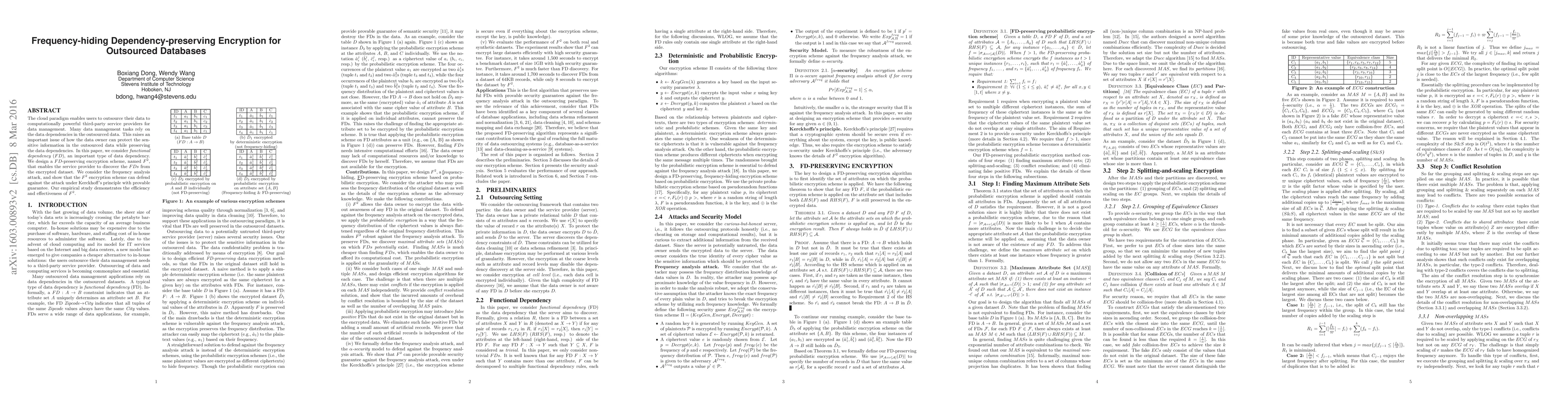 This paper proposes F2, a frequency-hiding dependency-preserving encryption scheme for outsourced databases, enabling third-party service providers to detect functional dependencies while safeguarding sensitive data against frequency analysis attacks. The scheme is shown to be efficient and effective in empirical studies.