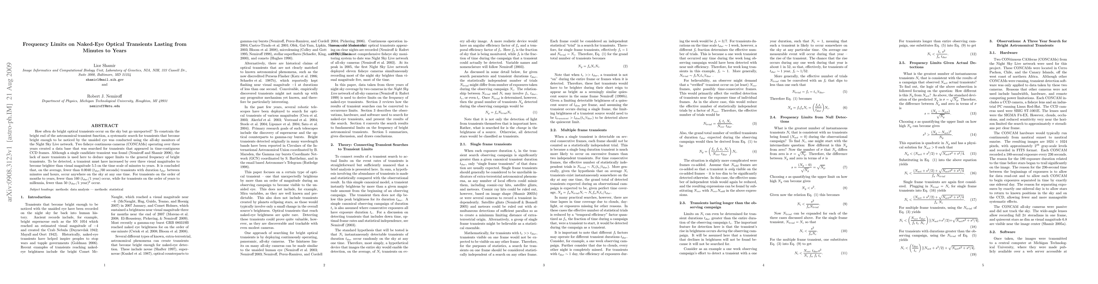 How often do bright optical transients occur on the sky but go unreported? To constrain the bright end of the astronomical transient function, a systematic search for transients that become bright enough to be noticed by the unaided eye was conducted using the all-sky monitors of the Night Sky Live network. Two fisheye continuous cameras (CONCAMs) operating over three years created a data base that was searched for transients that appeared in time-contiguous CCD frames. Although a single candidate transient was found (Nemiroff and Shamir 2006), the lack of more transients is used here to deduce upper limits to the general frequency of bright transients. To be detected, a transient must have increased by over three visual magnitudes to become brighter than visual magnitude 5.5 on the time scale of minutes to years. It is concluded that, on the average, fewer than 0.0040 ($t_{dur} / 60$ seconds) transients with duration $t_{dur}$ between minutes and hours, occur anywhere on the sky at any one time. For transients on the order of months to years, fewer than 160 ($t_{dur} / 1$ year) occur, while for transients on the order of years to millennia, fewer than 50 ($t_{dur}/1$ year)$^2$ occur.