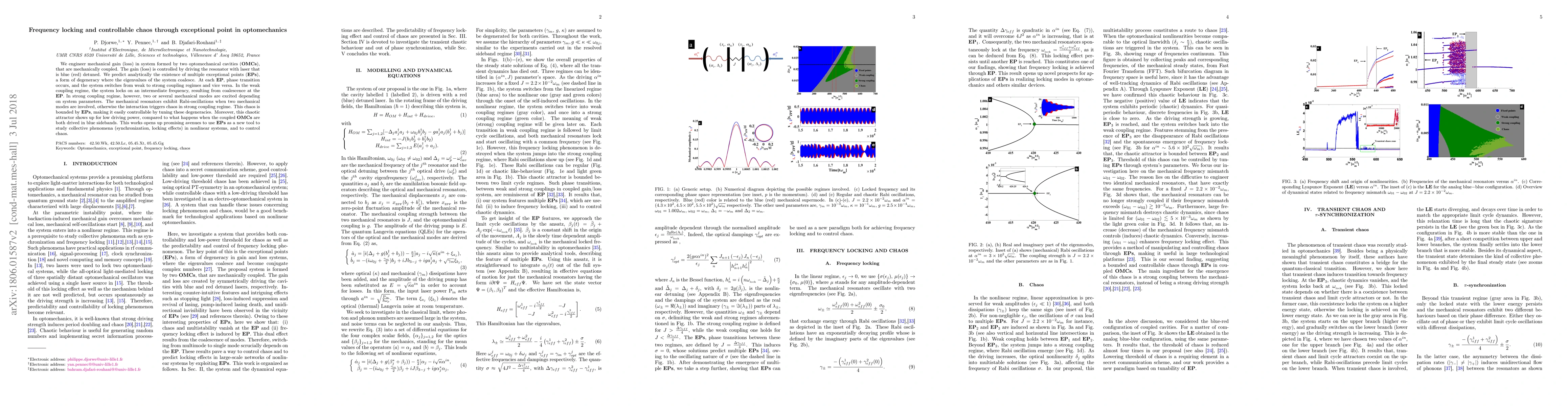 We engineer mechanical gain (loss) in system formed by two optomechanical cavities (OMCs), that are mechanically coupled. The gain (loss) is controlled by driving the resonator with laser that is blue (red) detuned. We predict analytically the existence of multiple exceptional points (EPs), a form of degeneracy where the eigenvalues of the system coalesce. At each EP, phase transition occurs, and the system switches from weak to strong coupling regimes and vice versa. In the weak coupling regime, the system locks on an intermediate frequency, resulting from coalescence at the EP. In strong coupling regime, however, two or several mechanical modes are excited depending on system parameters. The mechanical resonators exhibit Rabi-oscillations when two mechanical modes are involved, otherwise the interaction triggers chaos in strong coupling regime. This chaos is bounded by EPs, making it easily controllable by tuning these degeneracies. Moreover, this chaotic attractor shows up for low driving power, compared to what happens when the coupled OMCs are both drived in blue sidebands. This works opens up promising avenues to use EPs as a new tool to study collective phenomena (synchronization, locking effects) in nonlinear systems, and to control chaos.