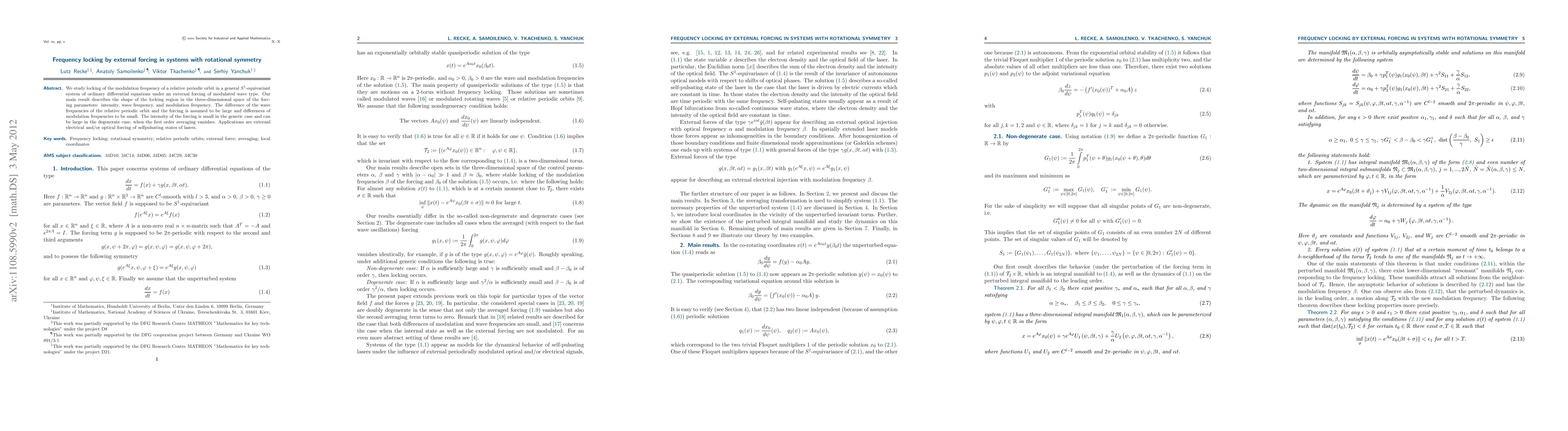 We study locking of the modulation frequency of a relative periodic orbit in a general $S^1$-equivariant system of ordinary differential equations under an external forcing of modulated wave type. Our main result describes the shape of the locking region in the three-dimensional space of the forcing parameters: intensity, wave frequency, and modulation frequency. The difference of the wave frequencies of the relative periodic orbit and the forcing is assumed to be large and differences of modulation frequencies to be small. The intensity of the forcing is small in the generic case and can be large in the degenerate case, when the first order averaging vanishes. Applications are external electrical and/or optical forcing of selfpulsating states of lasers.