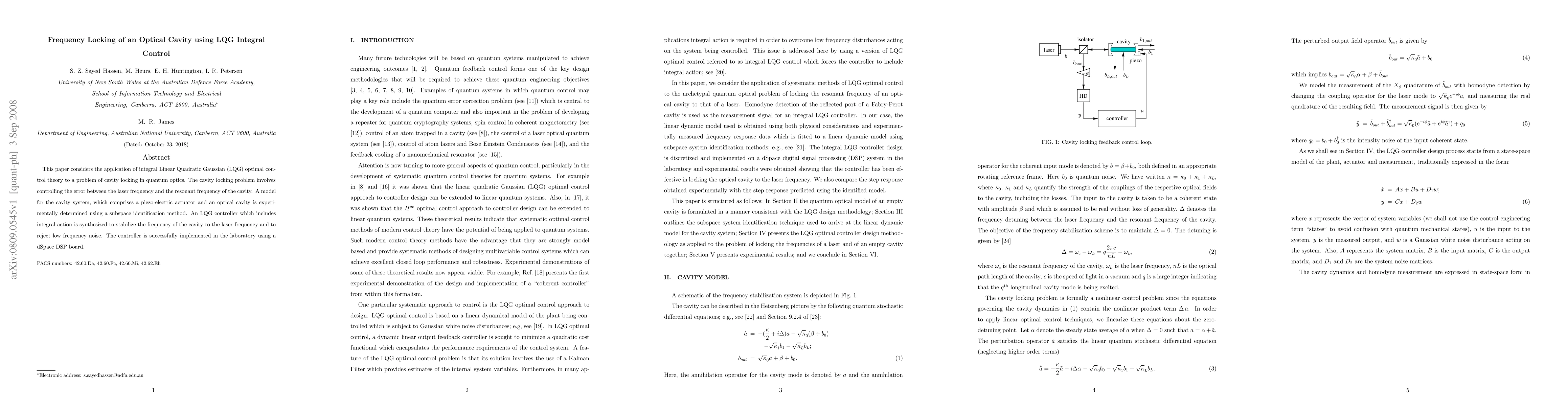 This paper considers the application of integral Linear Quadratic Gaussian (LQG) optimal control theory to a problem of cavity locking in quantum optics. The cavity locking problem involves controlling the error between the laser frequency and the resonant frequency of the cavity. A model for the cavity system, which comprises a piezo-electric actuator and an optical cavity is experimentally determined using a subspace identification method. An LQG controller which includes integral action is synthesized to stabilize the frequency of the cavity to the laser frequency and to reject low frequency noise. The controller is successfully implemented in the laboratory using a dSpace DSP board.