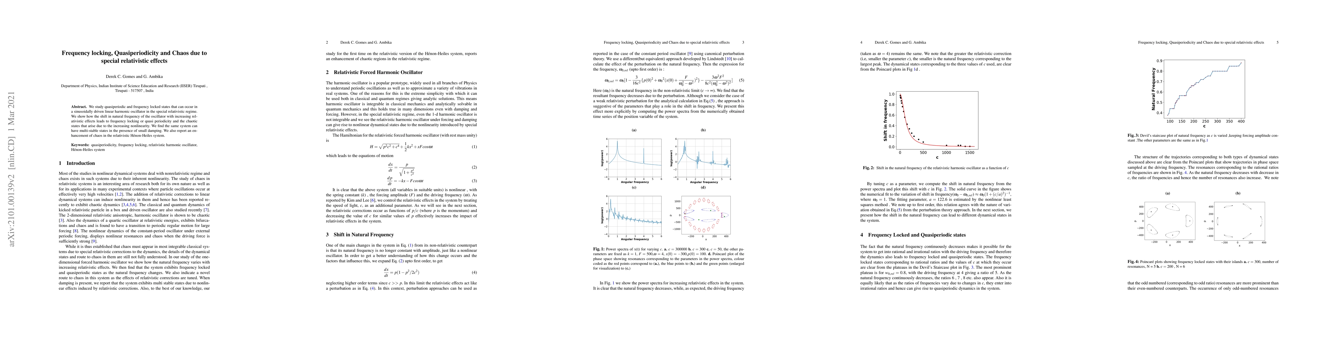 We study quasi periodic and frequency locked states that can occur in a sinusoidally driven linear harmonic oscillator in the special relativistic regime. We show how the shift in natural frequency of the oscillator with increasing relativistic effects leads to frequency locking or quasi periodicity and the chaotic states that arise due to the increasing non linearity. We find the same system can have multi-stable states in the presence of small damping. We also report an enhancement of chaos in the relativistic Henon-Heiles system.