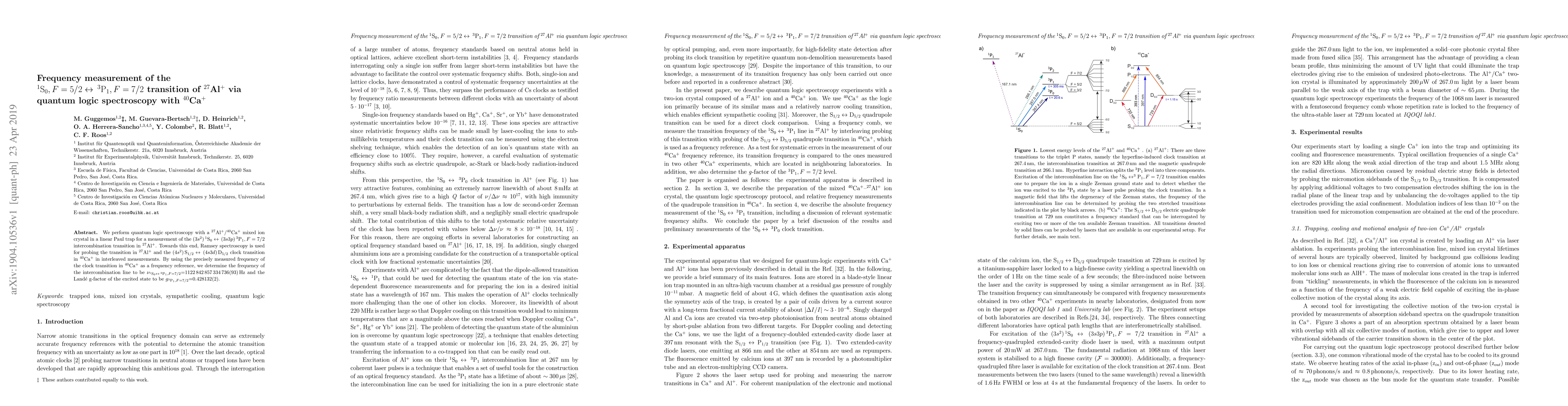 The research employs quantum logic spectroscopy with a mixed ion crystal of $^{27}$Al$^{+}$ and $^{40}$Ca$^{+}$ in a linear Paul trap. Ramsey spectroscopy is used to probe the $^{1}\mathrm{S}_{0}, F=5/2 \leftrightarrow \, ^{3}\mathrm{P}_{1}, F=7/2$ intercombination transition in $^{27}$Al$^{+}$ and the $(4s^{2})\, \mathrm{S}_{1/2} \leftrightarrow \, (4s3d)\, \mathrm{D}_{5/2}$ clock transition in $^{40}$Ca$^{+}$ in interleaved measurements.