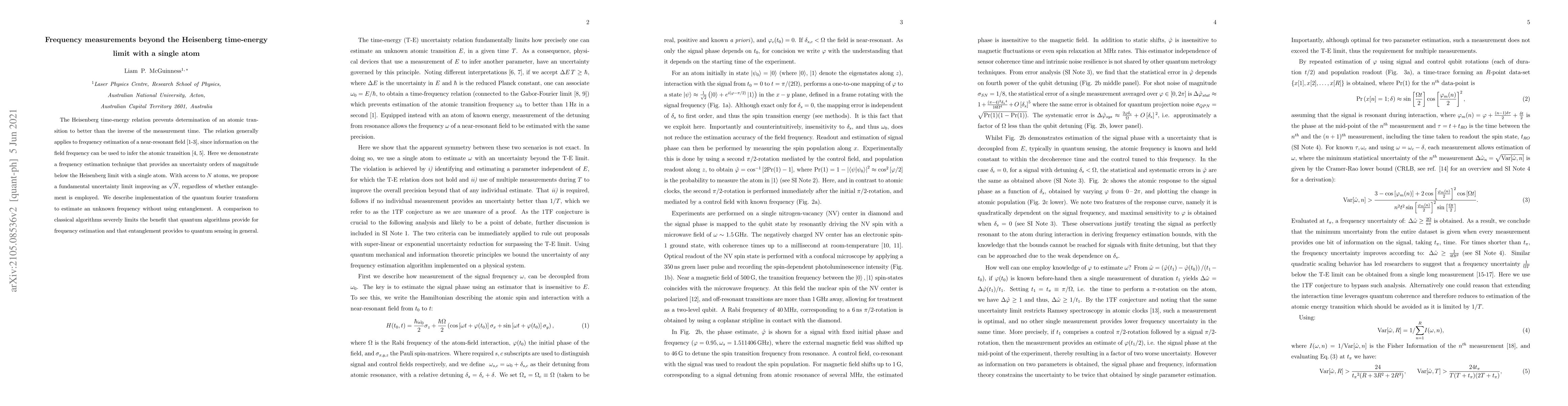 The Heisenberg time-energy relation prevents determination of an atomic transition to better than the inverse of the measurement time. The relation generally applies to frequency estimation of a near-resonant field [1-3], since information on the field frequency can be used to infer the atomic transition [4, 5]. Here we demonstrate a frequency estimation technique that provides an uncertainty orders of magnitude below the Heisenberg limit with a single atom. With access to $N$ atoms, we propose a fundamental uncertainty limit improving as $\sqrt{N}$, regardless of whether entanglement is employed. We describe implementation of the quantum fourier transform to estimate an unknown frequency without using entanglement. A comparison to classical algorithms severely limits the benefit that quantum algorithms provide for frequency estimation and that entanglement provides to quantum sensing in general.