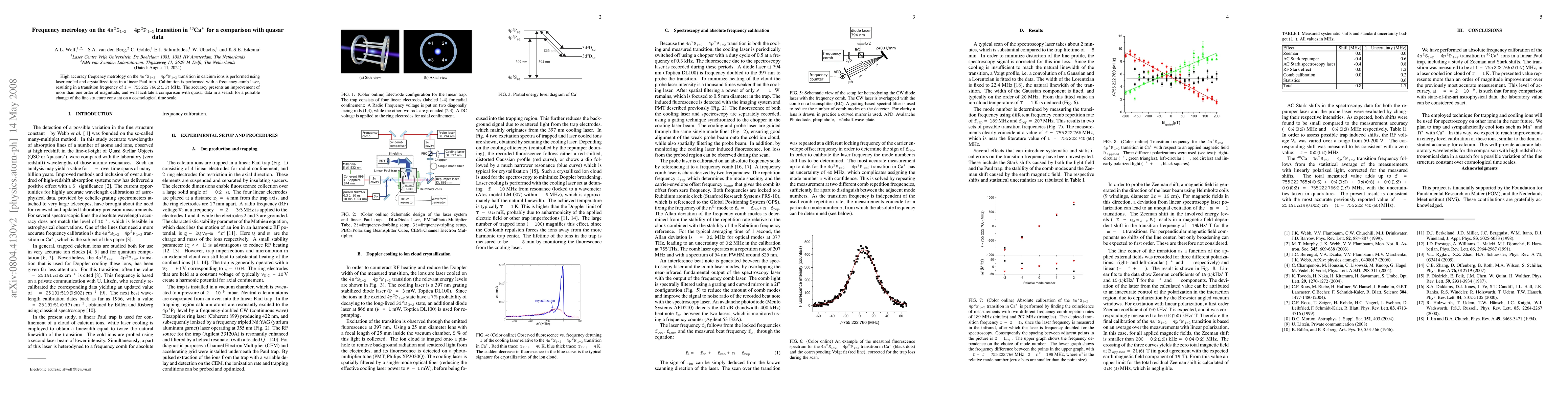 High accuracy frequency metrology on the 4s 2S1/2 - 4p 2P1/2 transition in calcium ions is performed using laser cooled and crystallized ions in a linear Paul trap. Calibration is performed with a frequency comb laser, resulting in a transition frequency of f=755222766.2(1.7) MHz. The accuracy presents an improvement of more than one order of magnitude, and will facilitate a comparison with quasar data in a search for a possible change of the fine structure constant on a cosmological time scale.
