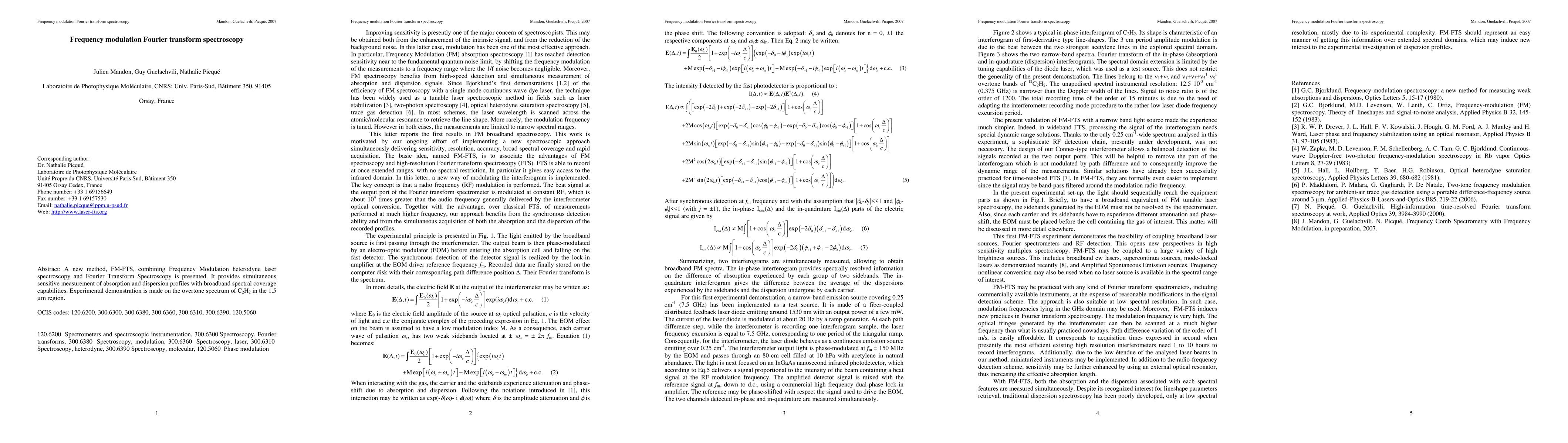 A new method, FM-FTS, combining Frequency Modulation heterodyne laser spectroscopy and Fourier Transform Spectroscopy is presented. It provides simultaneous sensitive measurement of absorption and dispersion profiles with broadband spectral coverage capabilities. Experimental demonstration is made on the overtone spectrum of C2H2 in the 1.5 $\mu$m region.