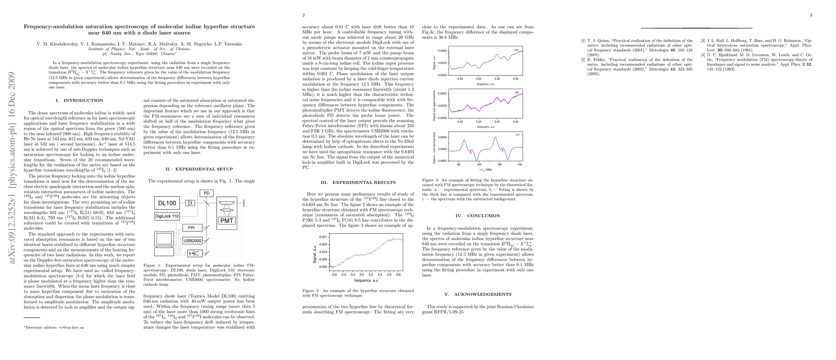 Frequency-modulation saturation spectroscopy was used to record molecular iodine hyperfine structure near 640 nm with a diode laser source.