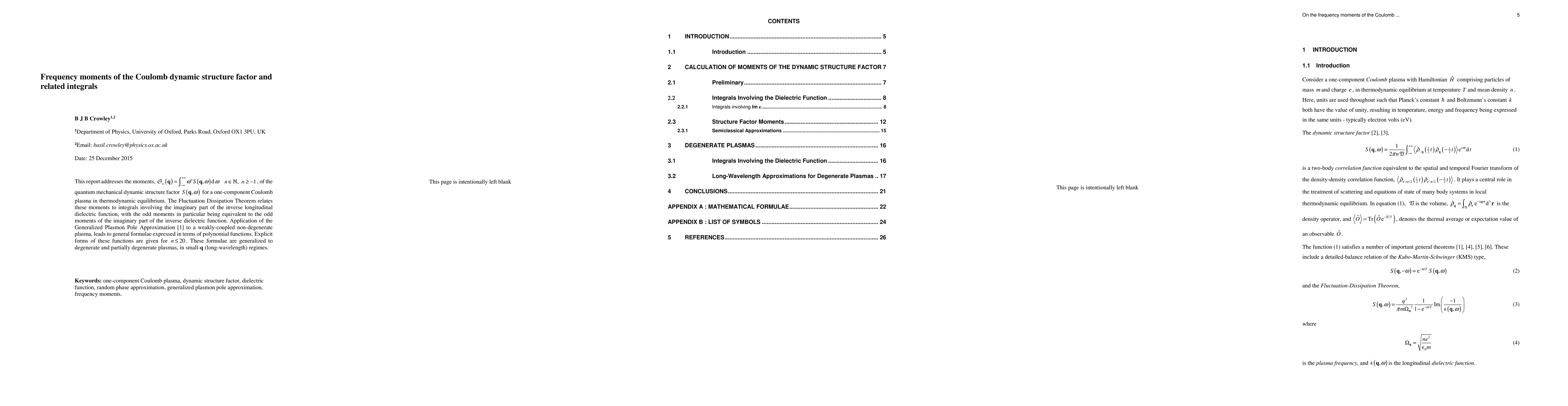 This report addresses the moments, ${\mathfrak{G}_n}\left( {\mathbf{q}} \right) = \int_{ - \infty }^{ + \infty } {{\omega ^n}S\left( {{\mathbf{q}},\omega } \right)\mathrm{d}\omega },\,n \in \mathbb{N},\,n \geq - 1$, of the quantum mechanical dynamic structure factor $S\left( {{\mathbf{q}},\omega } \right)$ for a one-component Coulomb plasma in thermodynamic equilibrium. The Fluctuation Dissipation Theorem relates these moments to integrals involving the imaginary part of the inverse longitudinal dielectric function, with the odd moments in particular being equivalent to the odd moments of the imaginary part of the inverse dielectric function. Application of the Generalized Plasmon Pole Approximation arXiv:1508.05606 [physics.plasm-ph] to a weakly-coupled non-degenerate plasma, leads to general formulae expressed in terms of polynomial functions. Explicit forms of these functions are given for $n \leq 20$. These formulae are generalized to degenerate and partially degenerate plasmas, in small-$\mathbf{q}$ (long-wavelength) regimes.