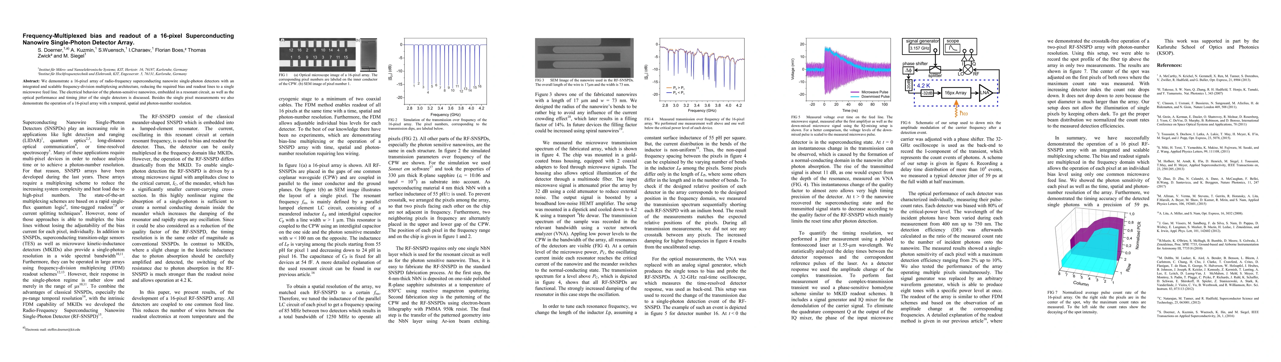 This paper presents a 16-pixel array of superconducting nanowire single-photon detectors with an integrated frequency-division multiplexing architecture, reducing bias and readout to a single microwave feed line. The study discusses the electrical and optical performance of the detectors and demonstrates the array's temporal, spatial, and photon-number resolution.