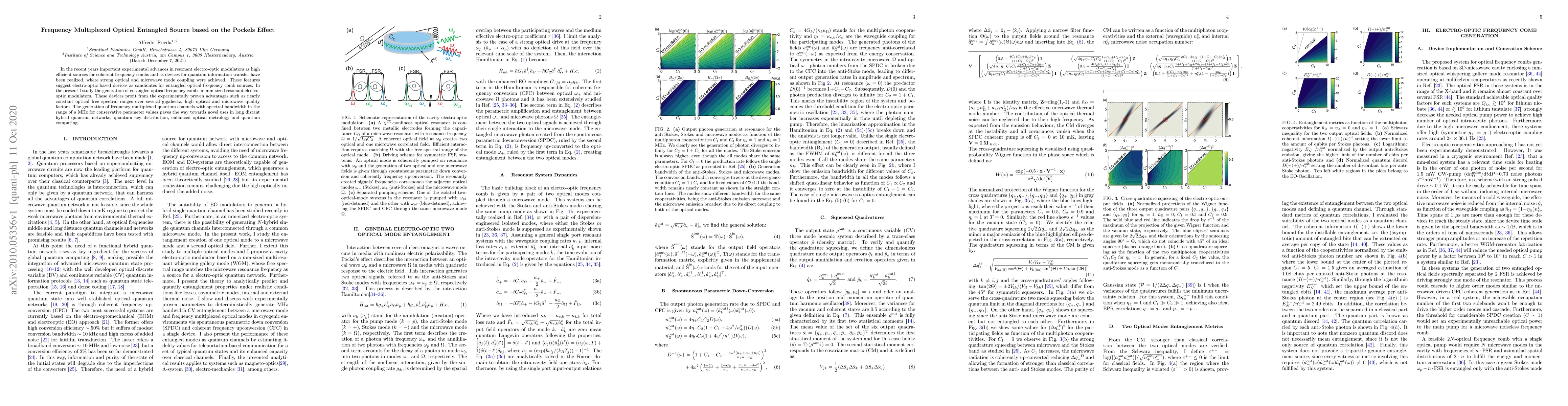 In the recent years important experimental advances in resonant electro-optic modulators as high efficient sources for coherent frequency combs and as devices for quantum information transfer have been realized, where strong optical and microwave mode coupling were achieved. These features suggest electro-optic based devices as candidates for entangled optical frequency comb sources. In the present I study the generation of entangled optical frequency combs in mm-sized resonant electro-optic modulators. These devices profit from the experimentally proven advantages such as nearly constant optical free spectral ranges over several gigahertz, high optical and microwave quality factors. The generation of frequency multiplexed quantum channels with spectral bandwidth in the range of a MHz for conservative parameter values paves the way towards novel uses in long distant hybrid quantum networks, quantum key distribution, enhanced optical metrology and quantum computing.