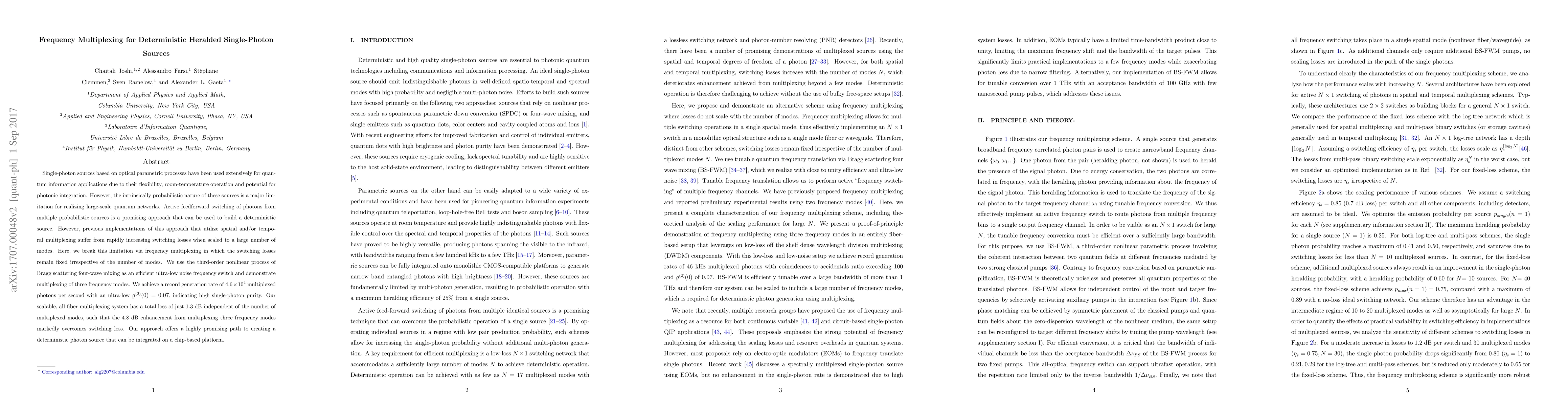 Single-photon sources based on optical parametric processes have been used extensively for quantum information applications due to their flexibility, room-temperature operation and potential for photonic integration. However, the intrinsically probabilistic nature of these sources is a major limitation for realizing large-scale quantum networks. Active feedforward switching of photons from multiple probabilistic sources is a promising approach that can be used to build a deterministic source. However, previous implementations of this approach that utilize spatial and/or temporal multiplexing suffer from rapidly increasing switching losses when scaled to a large number of modes. Here, we break this limitation via frequency multiplexing in which the switching losses remain fixed irrespective of the number of modes. We use the third-order nonlinear process of Bragg scattering four-wave mixing as an efficient ultra-low noise frequency switch and demonstrate multiplexing of three frequency modes. We achieve a record generation rate of $4.6\times10^4$ multiplexed photons per second with an ultra-low $g^{2}(0)$ = 0.07, indicating high single-photon purity. Our scalable, all-fiber multiplexing system has a total loss of just 1.3 dB independent of the number of multiplexed modes, such that the 4.8 dB enhancement from multiplexing three frequency modes markedly overcomes switching loss. Our approach offers a highly promising path to creating a deterministic photon source that can be integrated on a chip-based platform.