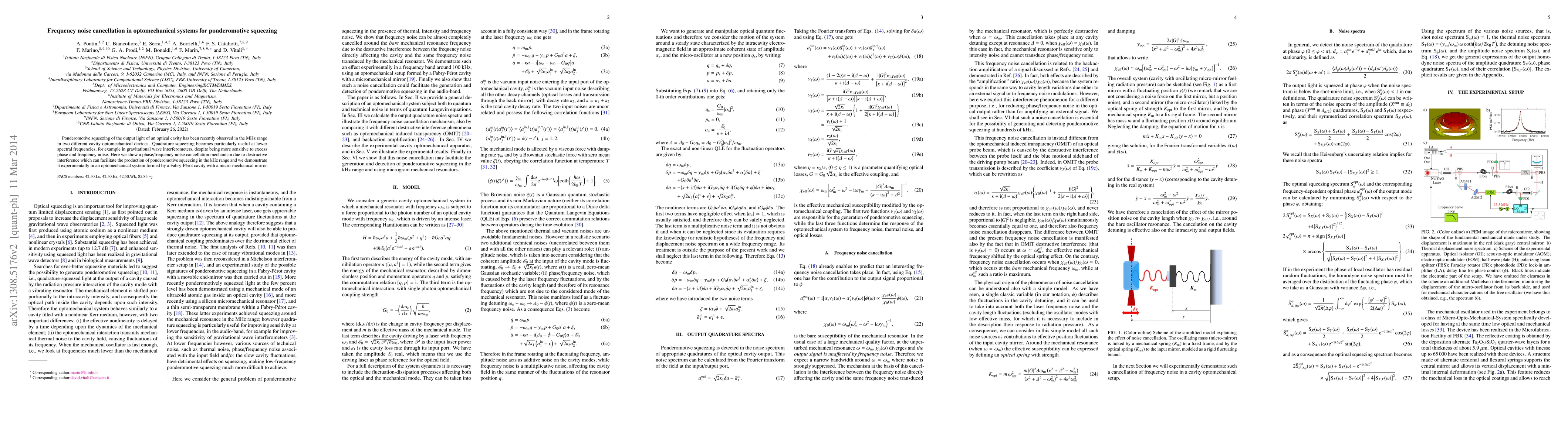 This paper presents a method for frequency noise cancellation in optomechanical systems to enhance ponderomotive squeezing, demonstrating its effectiveness experimentally in a Fabry-Pérot cavity with a micro-mechanical mirror. The technique leverages destructive interference to achieve squeezing in the kHz range, improving its applicability for gravitational wave detection.