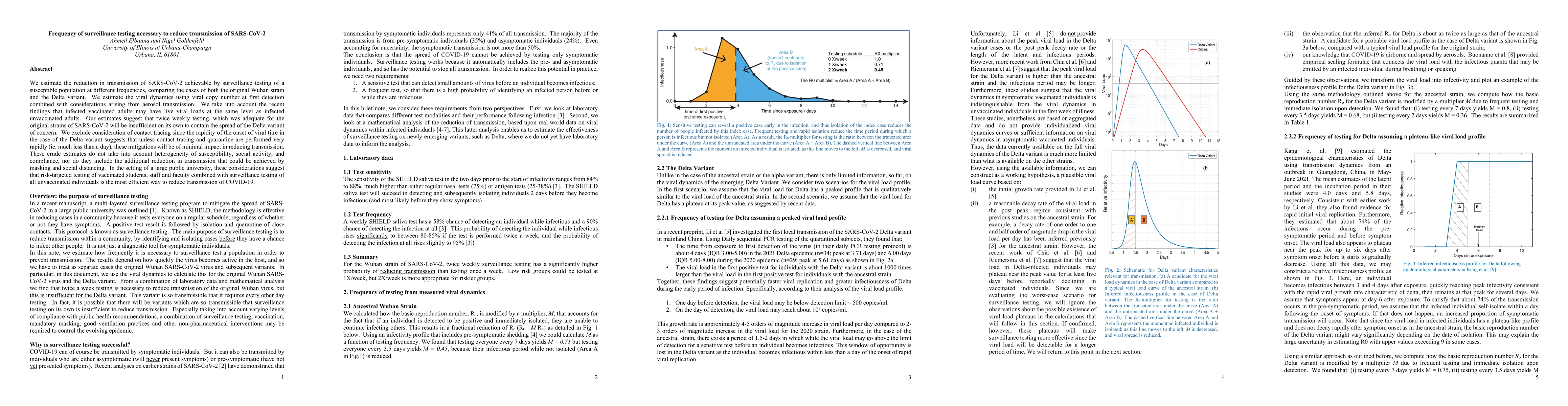 We estimate the reduction in transmission of SARS-CoV-2 achievable by surveillance testing of a susceptible population at different frequencies, comparing the cases of both the original Wuhan strain and the Delta variant. We estimate the viral dynamics using viral copy number at first detection combined with considerations arising from aerosol transmission. We take into account the recent findings that infected vaccinated adults may have live viral loads at the same level as infected unvaccinated adults. Our estimates suggest that twice weekly testing, which was adequate for the original strains of SARS-CoV-2 will be insufficient on its own to contain the spread of the Delta variant of concern. We exclude consideration of contact tracing since the rapidity of the onset of viral titre in the case of the Delta variant suggests that unless contact tracing and quarantine are performed very rapidly (ie. much less than a day), these mitigations will be of minimal impact in reducing transmission. These crude estimates do not take into account heterogeneity of susceptibility, social activity, and compliance, nor do they include the additional reduction in transmission that could be achieved by masking and social distancing. In the setting of a large public university, these considerations suggest that risk-targeted testing of vaccinated students, staff and faculty combined with surveillance testing of all unvaccinated individuals is the most efficient way to reduce transmission of COVID-19.