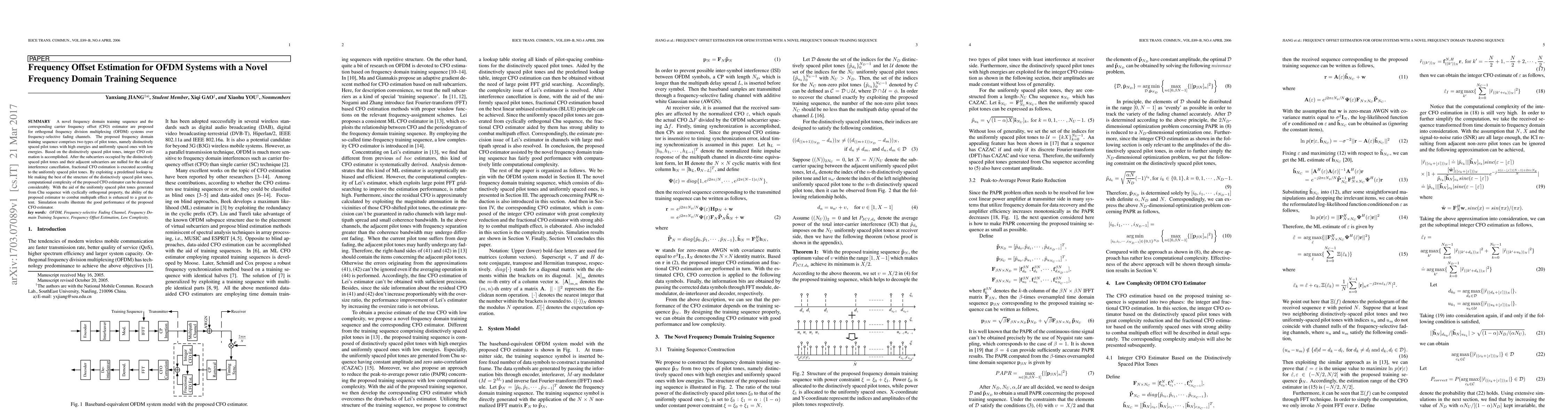 A novel frequency domain training sequence and the corresponding carrier frequency offset (CFO) estimator are proposed for orthogonal frequency division multiplexing (OFDM) systems over frequency-selective fading channels. The proposed frequency domain training sequence comprises two types of pilot tones, namely distinctively spaced pilot tones with high energies and uniformly spaced ones with low energies. Based on the distinctively spaced pilot tones, integer CFO estimation is accomplished. After the subcarriers occupied by the distinctively spaced pilot tones and their adjacent subcarriers are nulled for the sake of interference cancellation, fractional CFO estimation is executed according to the uniformly spaced pilot tones. By exploiting a predefined lookup table making the best of the structure of the distinctively spaced pilot tones, computational complexity of the proposed CFO estimator can be decreased considerably. With the aid of the uniformly spaced pilot tones generated from Chu sequence with cyclically orthogonal property, the ability of the proposed estimator to combat multipath effect is enhanced to a great extent. Simulation results illustrate the good performance of the proposed CFO estimator.