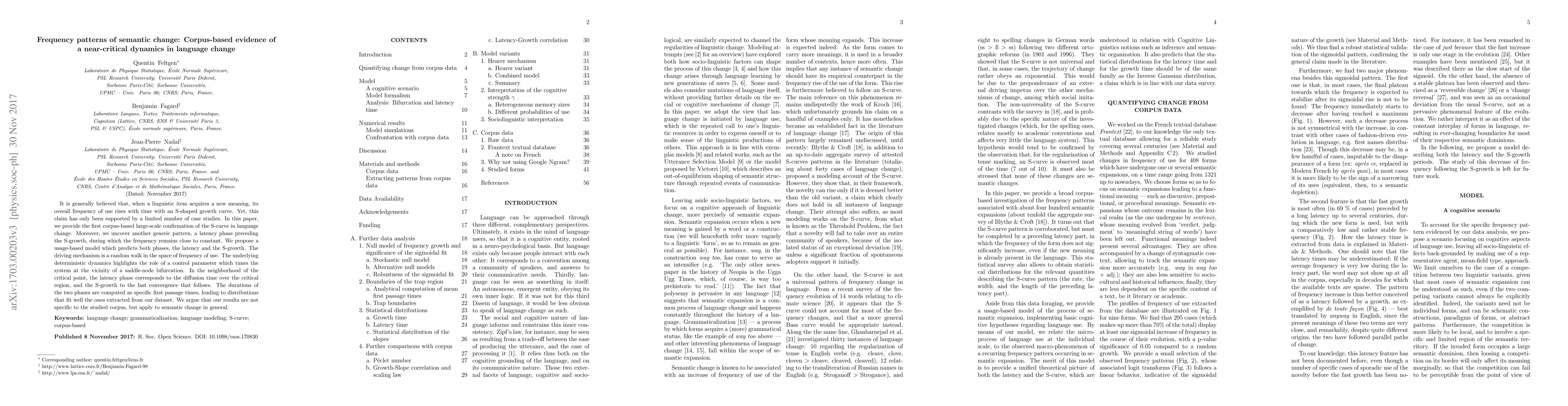 It is generally believed that, when a linguistic item acquires a new meaning, its overall frequency of use in the language rises with time with an S-shaped growth curve. Yet, this claim has only been supported by a limited number of case studies. In this paper, we provide the first corpus-based quantitative confirmation of the genericity of the S-curve in language change. Moreover, we uncover another generic pattern, a latency phase of variable duration preceding the S-growth, during which the frequency of use of the semantically expanding word remains low and more or less constant. We also propose a usage-based model of language change supported by cognitive considerations, which predicts that both phases, the latency and the fast S-growth, take place. The driving mechanism is a stochastic dynamics, a random walk in the space of frequency of use. The underlying deterministic dynamics highlights the role of a control parameter, the strength of the cognitive impetus governing the onset of change, which tunes the system at the vicinity of a saddle-node bifurcation. In the neighborhood of the critical point, the latency phase corresponds to the diffusion time over the critical region, and the S-growth to the fast convergence that follows. The duration of the two phases is computed as specific first passage times of the random walk process, leading to distributions that fit well the ones extracted from our dataset. We argue that our results are not specific to the studied corpus, but apply to semantic change in general.
